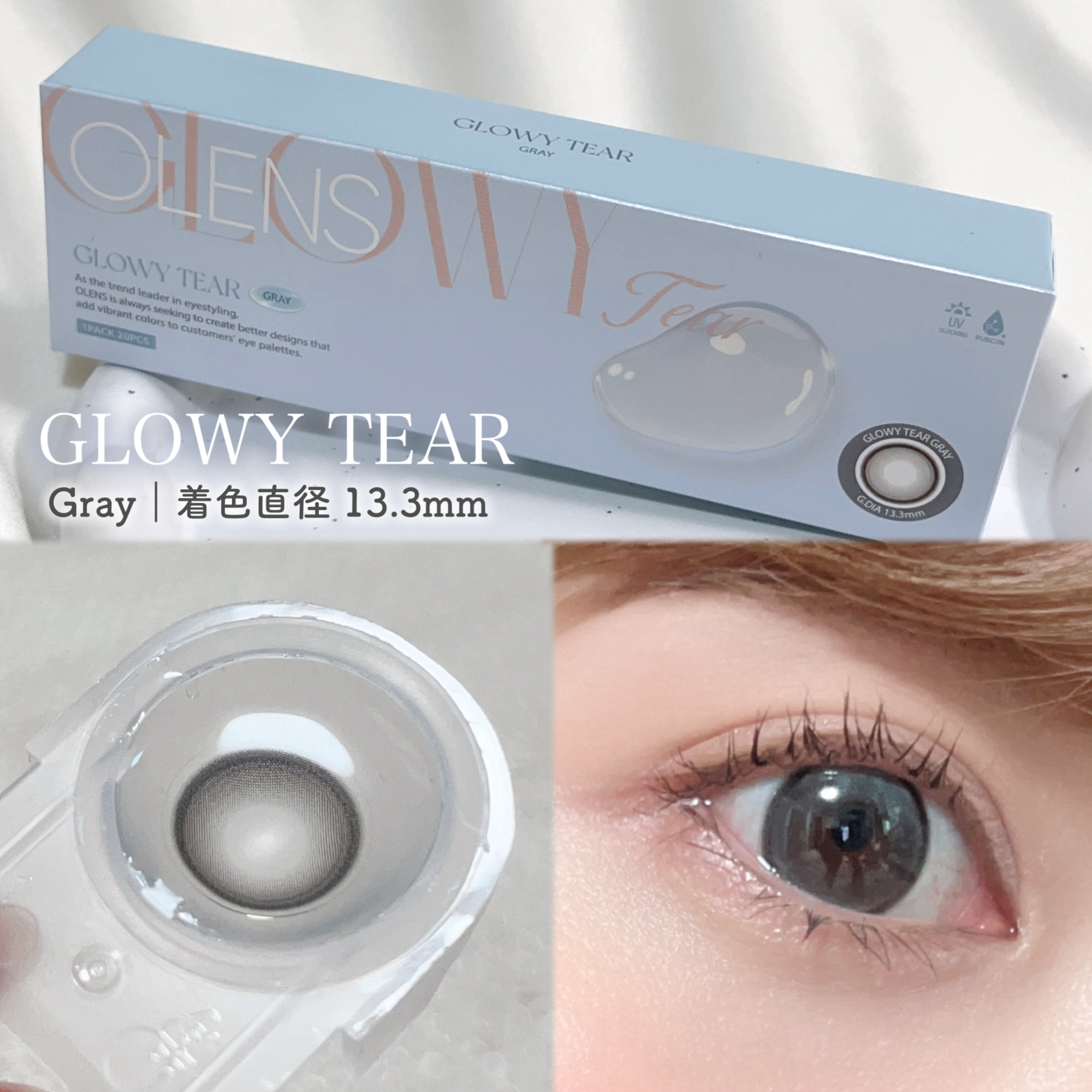 - 韓国カラコン業界の話題のブランド『OLENS(オーレンズ)』の日本正式承認商品シリーズ。世界中から注目を浴びるグループ「NewJeans (ニュージーンズ)」がイメージモデル。 OLENSの中でも圧倒的人気を誇る「グローイ」から、もっとうるみとぷるぷる感をプラスした「うるぷる×ツヤ盛れ!」な『グローイティア』が新シリーズとして登場。OLENSだから実現できる極微細着色との新感覚水光レンズです。 「Tear(涙)」から名を取ったように、まるで涙を浮かべたような、守ってあげたくなる目元を演出できます。 ■OLENS Glowy Tear (オーレンズグローイティア) ・枚数:1箱10枚入り ・カラー :全2色 ■使い方 コンタクトレンズは高度管理医療機器です。必ず眼科医の処方に従って購入してください。 ■使用上の留意事項 コンタクトレンズは高度管理医療機器です。眼科医の指導に従い装用期間を厳守し、正しくお使いください。眼の定期検査を必ず受けてください。添付文書を必ず読み、取扱方法、装用時間を守って正しくお使いください。少しでも異常を感じたら、直ちに眼科医の検査を受けてください。