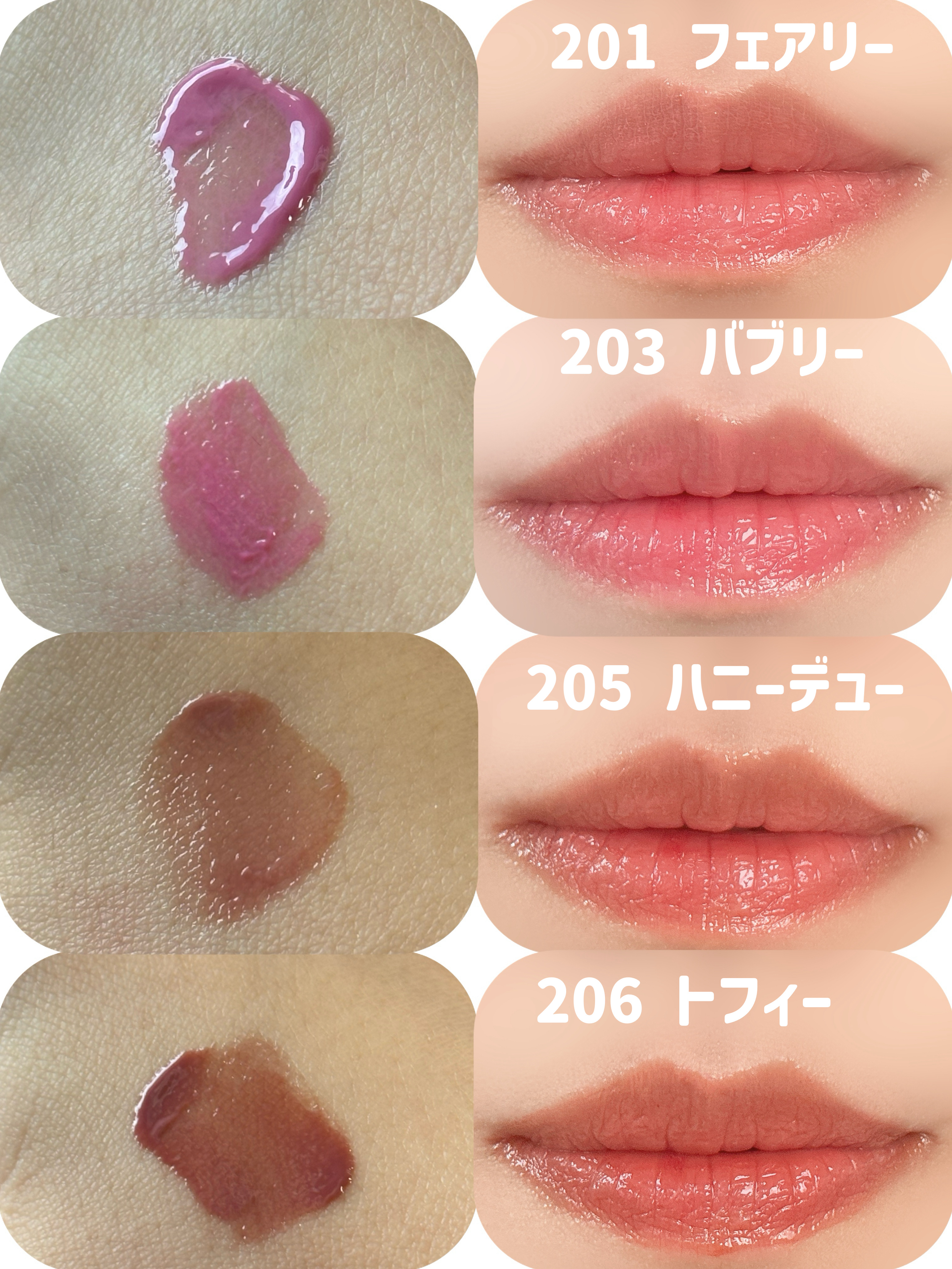 - <201 フェアリー> ダイマージリノール酸ジイソステアリル、ジフェニルシロキシフェニルトリメチコン、ビスジグリセリルポリアシルアジペート-2、水、ジフェニルジメチコン、水添ポリイソブテン、セチルPEG/PPG-10/1ジメチコン、ポリソルベート60、ペンチレングリコール、グリセリン、イソステアリン酸ポリグリセリル-4、フェノキシエタノール、1,2-ヘキサンジオール、セテアレス-20、酸化チタン (CI 77891)、(アクリル酸ヒドロキシエチル/アクリロイルジメチルタウリンNa)コポリマー、ステビオシド、スクワラン、香料、ジラウラミドグルタミドリシンNa、エチルヘキシルグリセリン、エチレンジアミンジコハク酸3Na、赤色227号 (CI 17200)、水酸化Al、黄色5号 (CI 15985)、ポリアクリル酸アンモニウム、イソステアリン酸ソルビタン、黄色4号 (CI 19140)、BG、赤色223号 (CI 45410)、青色1号 (CI 42090)、アラントイン、パンテノール、ツボクサエキス、ヒアルロン酸、加水分解ヒアルロン酸、ヒアルロン酸Na <203 バブリー> ダイマージリノール酸ジイソステアリル、ジフェニルシロキシフェニルトリメチコン、ビスジグリセリルポリアシルアジペート-2、水、ジフェニルジメチコン、水添ポリイソブテン、セチルPEG/PPG-10/1ジメチコン、ポリソルベート60、ペンチレングリコール、グリセリン、イソステアリン酸ポリグリセリル-4、フェノキシエタノール、1,2-ヘキサンジオール、セテアレス-20、(アクリル酸ヒドロキシエチル/アクリロイルジメチルタウリンNa)コポリマー、ステビオシド、酸化チタン (CI 77891)、スクワラン、香料、ジラウラミドグルタミドリシンNa、エチルヘキシルグリセリン、赤色227号 (CI 17200)、エチレンジアミンジコハク酸3Na、黄色5号 (CI 15985)、イソステアリン酸ソルビタン、水酸化Al、ポリアクリル酸アンモニウム、黄色4号 (CI 19140)、BG、青色1号 (CI 42090)、アラントイン、パンテノール、ツボクサエキス、ヒアルロン酸、加水分解ヒアルロン酸、ヒアルロン酸Na <204 レア> ダイマージリノール酸ジイソステアリル、ジフェニルシロキシフェニルトリメチコン、ビスジグリセリルポリアシルアジペート-2、水、ジフェニルジメチコン、水添ポリイソブテン、セチルPEG/PPG-10/1ジメチコン、ポリソルベート60、ペンチレングリコール、グリセリン、イソステアリン酸ポリグリセリル-4、フェノキシエタノール、1,2-ヘキサンジオール、セテアレス-20、(アクリル酸ヒドロキシエチル/アクリロイルジメチルタウリンNa)コポリマー、酸化チタン (CI 77891)、ステビオシド、スクワラン、香料、ジラウラミドグルタミドリシンNa、エチルヘキシルグリセリン、赤色227号 (CI 17200)、黄色5号 (CI 15985)、エチレンジアミンジコハク酸3Na、イソステアリン酸ソルビタン、水酸化Al、ポリアクリル酸アンモニウム、黄色4号 (CI 19140)、青色1号 (CI 42090)、BG、アラントイン、パンテノール、ツボクサエキス、ヒアルロン酸、加水分解ヒアルロン酸、ヒアルロン酸Na <205 ハニーデュー> ダイマージリノール酸ジイソステアリル、ジフェニルシロキシフェニルトリメチコン、ビスジグリセリルポリアシルアジペート-2、水、ジフェニルジメチコン、水添ポリイソブテン、セチルPEG/PPG-10/1ジメチコン、ポリソルベート60、ペンチレングリコール、グリセリン、イソステアリン酸ポリグリセリル-4、フェノキシエタノール、1,2-ヘキサンジオール、セテアレス-20、(アクリル酸ヒドロキシエチル/アクリロイルジメチルタウリンNa)コポリマー、酸化チタン (CI 77891)、ステビオシド、スクワラン、香料、ジラウラミドグルタミドリシンNa、エチルヘキシルグリセリン、赤色227号 (CI 17200)、黄色5号 (CI 15985)、エチレンジアミンジコハク酸3Na、イソステアリン酸ソルビタン、水酸化Al、ポリアクリル酸アンモニウム、黄色4号 (CI 19140)、青色1号 (CI 42090)、BG、アラントイン、パンテノール、ツボクサエキス、ヒアルロン酸、加水分解ヒアルロン酸、ヒアルロン酸Na <206 トフィー> ダイマージリノール酸ジイソステアリル、ジフェニルシロキシフェニルトリメチコン、ビスジグリセリルポリアシルアジペート-2、水、ジフェニルジメチコン、水添ポリイソブテン、セチルPEG/PPG-10/1ジメチコン、ポリソルベート60、ペンチレングリコール、グリセリン、イソステアリン酸ポリグリセリル-4、フェノキシエタノール、1,2-ヘキサンジオール、セテアレス-20、(アクリル酸ヒドロキシエチル/アクリロイルジメチルタウリンNa)コポリマー、ステビオシド、スクワラン、香料、ジラウラミドグルタミドリシンNa、酸化チタン (CI 77891)、エチルヘキシルグリセリン、黄色5号 (CI 15985)、エチレンジアミンジコハク酸3Na、黄色4号 (CI 19140)、赤色227号 (CI 17200)、イソステアリン酸ソルビタン、赤色223号 (CI 45410)、青色1号 (CI 42090)、水酸化Al、ポリアクリル酸アンモニウム、BG、アラントイン、パンテノール、ツボクサエキス、ヒアルロン酸、加水分解ヒアルロン酸、ヒアルロン酸Na <207 フレイム> ダイマージリノール酸ジイソステアリル、ジフェニルシロ