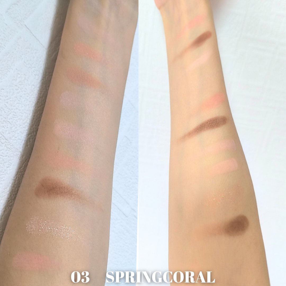 - <01 ウォームベーシック> タルク、マイカ、酸化鉄、ジメチコン、酸化チタン、オクテニルコハク酸デ ンプンAl、合成フルオロフロゴパイト、ナイロン-12、シリカ、ホウケイ酸 (Ca/チタン)、ミリスチン酸Mg、ホウケイ酸(Ca/Al)、マンガンバイオ レット、窒化ホウ素、フェニルトリメチコン、メチルプロパンジオール、ステアロイ ルオキシステアリン酸オクチルドデシル、ジエチルヘキサン酸ネオペンチルグリ コール、トリ(カプリル酸/カプリン酸)グリセリル、メタクリル酸メチルクロスポ リマー、グンジョウ、水添ポリイソブテン、ヘキサ(ヒドロキシステアリン酸/ステ アリン酸/ロジン酸)ジペンタエリスリチル、プロパンジオール、(HDI/トリ メチロールヘキシルラクトン)クロスポリマー、ポリメタクリル酸メチル、リンゴ 酸ジイソステアリル、ステアリン酸Mg、マカデミア種子油、トリエトキシカプリ リルシラン、トリエチルヘキサノイン、黄4、ラウリン酸ヘキシル、ネオペンタン 酸イソステアリル、(ジメチコン/ビニルジメチコン)クロスポリマー、(ヘキシ ルデカン酸/セバシン酸)ジグリセリルオリゴエステル、ステアリン酸ジメチコ ノール、ポリブチレンテレフタレート、水酸化Al、オクチルドデカノール、セス キイソステアリン酸ソルビタン、ラウロイルリシン、ホウケイ酸(Ca/Na)、ポ リブテン、カオリン、水添レシチン、ジフェニルシロキシフェニルトリメチコン、メ チコン、PET、ポリプロピレン、フェノキシエタノール、ダイマージリノール酸 水添ヒマシ油、アクリレーツコポリマー、赤226、ダイマージリノール酸(フィ トステリル/イソステアリル/セチル/ステアリル/ベヘニル)、(エチレン/ VA)コポリマー、酸化スズ、合成ワックス、結晶セルロース、ジステアルジモニ ウムヘクトライト、炭酸プロピレン、トコフェロール <02 クールベーシック> タルク、マイカ、酸化鉄、シリカ、合成フルオロフロゴパイト、酸化チタ ン、窒化ホウ素、トリ(カプリル酸/カプリン酸)グリセリル、マンガンバイオレッ ト、ミリスチン酸Mg、フェニルトリメチコン、グンジョウ、ステアロイルオキシス テアリン酸オクチルドデシル、ジメチコン、メチルプロパンジオール、ナイロン- 12、オクチルドデカノール、ステアリン酸Mg、ヘキサ(ヒドロキシステアリン 酸/ステアリン酸/ロジン酸)ジペンタエリスリチル、プロパンジオール、リンゴ 酸ジイソステアリル、マカデミア種子油、ホウケイ酸(Ca/Al)、(HDI/ト リメチロールヘキシルラクトン)クロスポリマー、ポリメタクリル酸メチル、ポリ ブチレンテレフタレート、ホウケイ酸(Ca/チタン)、トリエトキシカプリリルシ ラン、パルミチン酸エチルヘキシル、赤226、ステアリン酸ジメチコノール、オ クテニルコハク酸デンプンAl、ジエチルヘキサン酸ネオペンチルグリコール、メタクリル酸メチルクロスポリマー、メチコン、カオリン、ホウケイ酸(Ca/N a)、ラウロイルリシン、ポリプロピレン、アクリレーツコポリマー、水酸化Al、サラソウジュ種子脂、水添レシチン、ヒドロキシプロピルビスパルミタミドME A、水添ポリイソブテン、(エチレン/VA)コポリマー、ラウリン酸ヘキシル、ネ オペンタン酸イソステアリル、ビスジグリセリルポリアシルアジペート-2、(ジ メチコン/ビニルジメチコン)クロスポリマー、(ヘキシルデカン酸/セバシン 酸)ジグリセリルオリゴエステル、セスキイソステアリン酸ソルビタン、ポリブテ ン、酸化スズ、合成ワックス、トリエチルヘキサノイン、(エチレン/プロピレン/ スチレン)コポリマー、フェノキシエタノール、(ラウリルジメチコン/ポリグリセ リン-3)クロスポリマー、トリイソステアリン酸ポリグリセリル-2、(ブチレン /エチレン/スチレン)コポリマー、黄4、DPG、テトラ(ジ-t-ブチルヒド ロキシヒドロケイヒ酸)ペンタエリスリチル、クエン酸Na、トコフェロール <03 スプリングコーラル> タルク、マイカ、酸化鉄、酸化チタン、合成フルオロフロゴパイト、シリ カ、ホウケイ酸(Ca/チタン)、オクテニルコハク酸デンプンAl、フェニルトリ メチコン、ステアロイルオキシステアリン酸オクチルドデシル、ミリスチン酸M g、ホウケイ酸(Ca/Al)、ポリブチレンテレフタレート、ジメチコン、メチル プロパンジオール、ナイロン-12、ビスジグリセリルポリアシルアジペート- 2、トリ(カプリル酸/カプリン酸)グリセリル、ステアリン酸Mg、窒化ホウ素、ホウケイ酸(Ca/Na)、ポリプロピレン、リンゴ酸ジイソステアリル、ジフェニ ルシロキシフェニルトリメチコン、グンジョウ、プロパンジオール、マカデミア種 子油、マンガンバイオレット、アクリレーツコポリマー、(エチレン/VA)コポリ マー、オクチルドデカノール、ヘキサ(ヒドロキシステアリン酸/ステアリン酸/ ロジン酸)ジペンタエリスリチル、ダイマージリノール酸水添ヒマシ油、トリイソ ステアリン酸ポリグリセリル-2、ダイマージリノール酸(フィトステリル/イソ ステアリル/セチル/ステアリル/ベヘニル)、テトラ(ヒドロキ