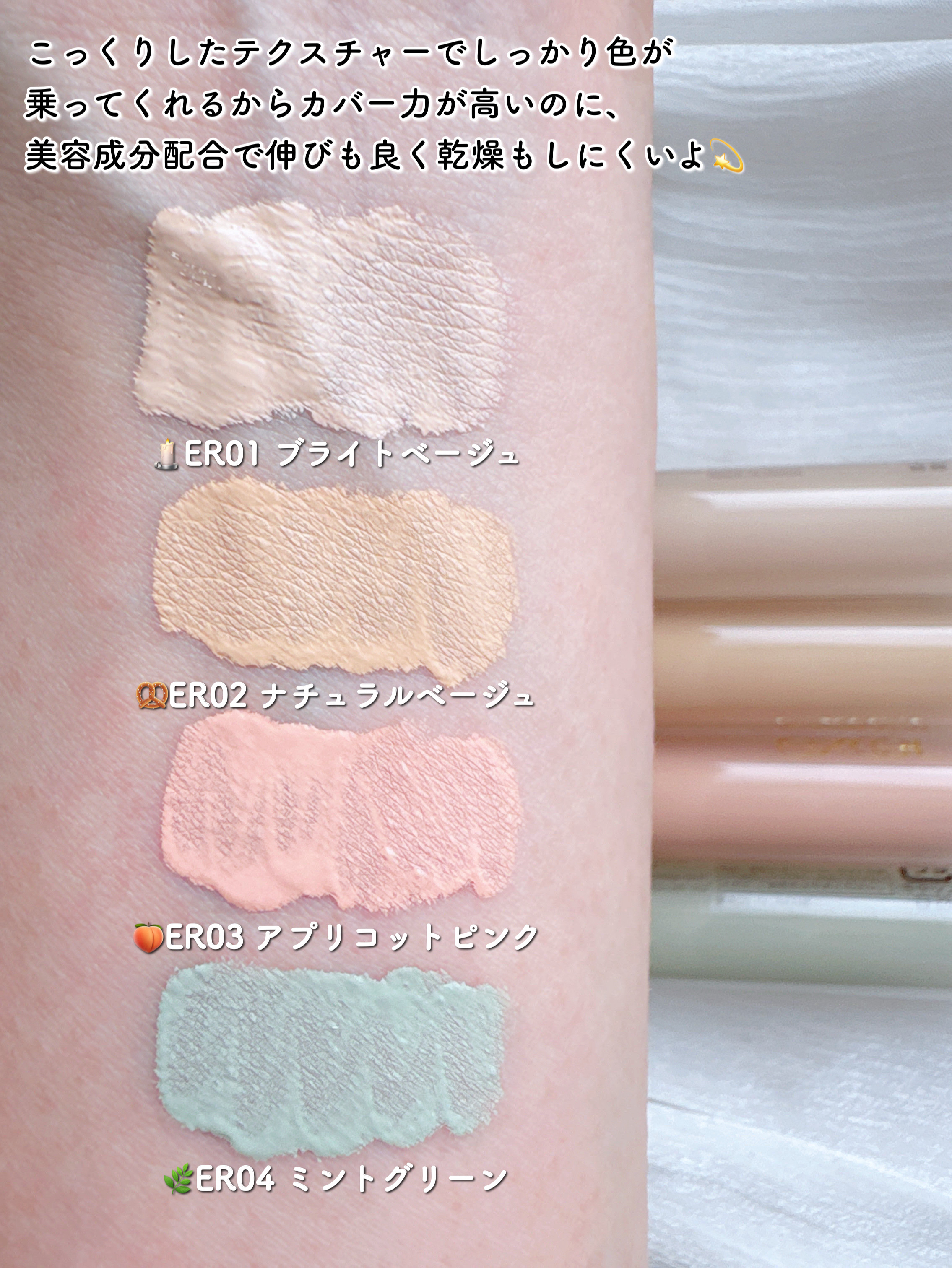 - <ER01 ブライトベージュ> 水、BG、ジフェニルシロキシフェニルトリメチコン、メチルトリメチコン、水添ポリデセン、プロパンジオール、マカデミア種子油、ラウリルPEG-9ポリジメチルシロキシエチルジメチコン、タルク、セスキイソステアリン酸ソルビタン、マルチトール、トリメチルシロキシケイ酸、3-0-エチルアスコルビン酸、ナイアシンアミド、ジペプチドー15、セラミドNG、セラミドNP、セラミドAP、アスコルビン酸、グルタチオン、ノイバラ果実エキス、シア、ジステアルジモニウムヘクトライト、テトライソステアリン酸ポリグリセリルー2、トリベヘニン、トリポリヒドロキシステアリン酸ジペンタエリスリチル、ハイドロゲンジメチコン、フィトステロールズ、塩化Na、水酸化AL、水添レシチン、クロルフェネシン、デヒドロ酢酸Na、フェノキシエタノール、マイカ、酸化チタン、酸化鉄 <ER02 ナチュラルベージュ> 水、BG、メチルトリメチコン、ジフェニルシロキシフェニルトリメチコン、水添ポリデセン、プロパンジオール、タルク、マカデミア種子油、ラウリルPEG-9ポリジメチルシロキシエチルジメチコン、セスキイソステアリン酸ソルビタン、マルチトール、トリメチルシロキシケイ酸、3-0-エチルアスコルビン酸、ナイアシンアミド、ジペプチドー15、セラミドNG、セラミドNP、セラミドAR、エクト イン、グリチルリチン酸2K、ノイバラ果実エキス、シア脂、ジステアルジモニウムヘクトライト、テトライソステアリン酸ポリグリセリルー2、トリベヘニン、トリポリヒドロキシステアリン酸ジペンタ エリスリチル、ハイドロゲンジメチコン、フィトステロールズ、塩化Na、水酸化Al、水添レシチン、クロルフェネシン、デヒドロ酢酸Na、フェノキシエタノール、酸化チタン、酸化鉄 <ER03 アプリコットピンク> 水、タルク、BG、メチルトリメチコン、ジフェニルシロキシフェニルトリメチコン、水添ポリデセン、プロパンジオール、マカデミア種子油、ラウリルPEG-9ポリジメチルシロキシエチルジメチコン、セスキイソステアリン酸ソルビタン、マルチトール、トリメチルシロキシケイ酸、3-0-エチルアスコルビン酸、ナイアシンアミド、ジペプチドー15、セラミドNG、セラミドNP、セラミドAP、酢酸トコフェロール、カフェイン、ノイバラ果実エキス、シア脂、ジステアルジモニウムヘクトライト、テトライソステアリン酸ポリグリセリルー2、トリベへニン、トリポリヒドロキシステアリン酸ジペンタエリスリ チル、ハイドロゲンジメチコン、フィトステロールズ、塩化Na、水酸化Al、水添レシチン、クロルフェネシン、デヒドロ酢酸Na、フェノキシエタノール、酸化チタン、酸化鉄 <ER04 ミントグリーン> 水、BG、タルク、メチルトリメチコン、ジフェニルシロキシフェニルトリメチコン、水添ポリデセン、プロパンジオール、マカデミア種子油、ラウリルPEG-9ポリジメチルシロキシエチルジメチコン、セスキイソステアリン酸ソルビタン、マルチトール、トリメチルシロキシケイ酸、3-0-エチルアスコルビン酸、ナイアシンアミド、ジペプチドー15、セラミドNG、セラミドNP、セラミドAP、ツボクサエキス、アゼロイルジグリシンK、ノイバラ果実エキス、シア脂、ジステアルジモニウムヘクトライト、テトライソステアリン酸ポリグリセリルー2、トリエトキシカプリリルシラン、トリベヘニン、トリポリヒドロキシステ アリン酸ジペンタエリスリチル、ハイドロゲンジメチコン、フィトステロールズ、塩化Na、水酸化AL、添レシチン、クロルフェネシン、デヒドロ酢酸Na、フェノキシエタノール、グンジョウ、酸化チタン、酸化鉄 <ER05 アイシーブルー(限定色)> 水、BG、メチルトリメチコン、タルク、ジフェニルシロキシフェニルトリメチコン、水添ポリデセン、プロパンジオール、マカデミア種子油、ラウリルPEG-9ポリジメチルシロキシエチルジメチコン、セスキ イソステアリン酸ソルビタン、マルチトール、トリメチルシロキシケイ酸、3-0-エチルアスコルビン酸、ナイアシンアミド、ジペプチドー15、セラミドNG、セラミドNP、セラミドAP、ツボクサエキス、グルタチオン、ノイバラ果実エキス、シア脂、ジステアルジモニウムヘクトライト、テトライソステアリン酸ポリグリセリルー2、トリエトキシカプリリルシラン、トリベへニン、トリポリヒドロキシステアリン酸ジペンタエリスリチル、ハイドロゲンジメチコン、フィトステロールズ、塩化Na、水酸化 Al、水添レシチン、クロルフェネシン、デヒドロ酢酸Na、フェノキシエタノール、グンジョウ、マイカ、酸化チタン