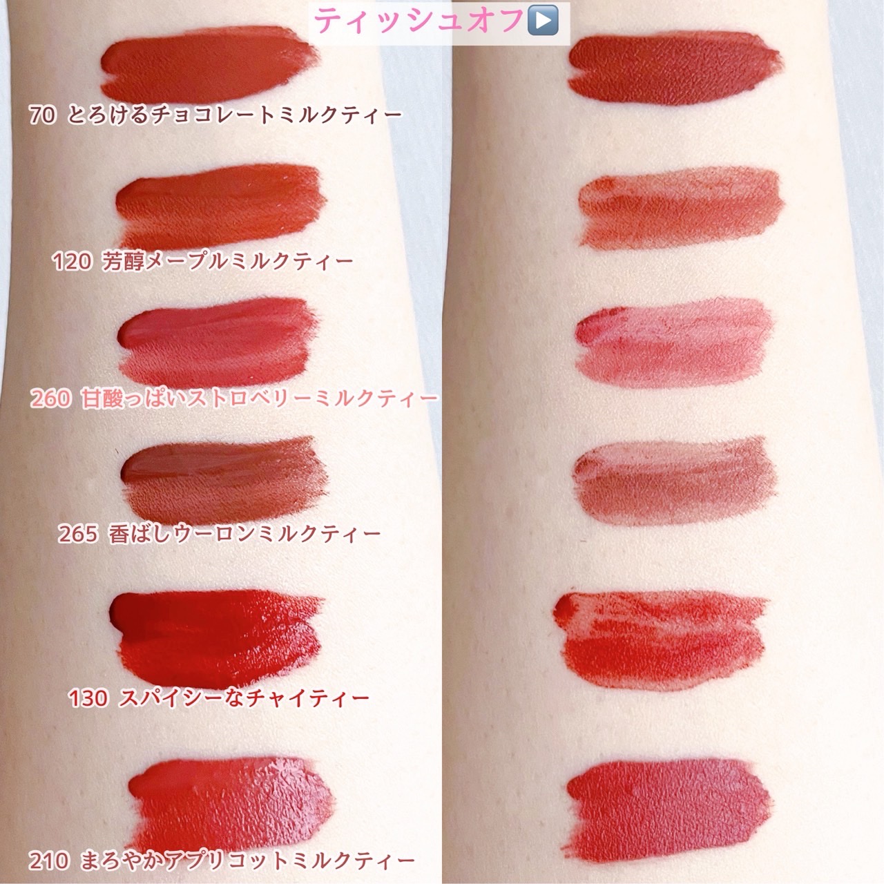 秋冬にぴったり♡落ち着いて、ビターなメイベリンのパールミルクティコレクションをスウォッチ✨️🥰MAYBELLINENEWYORKメイベリンニューヨークSPステイヴィニルインク260(甘酸っぱいストロベリーミルクティー)★限定色265(香ばしウ...