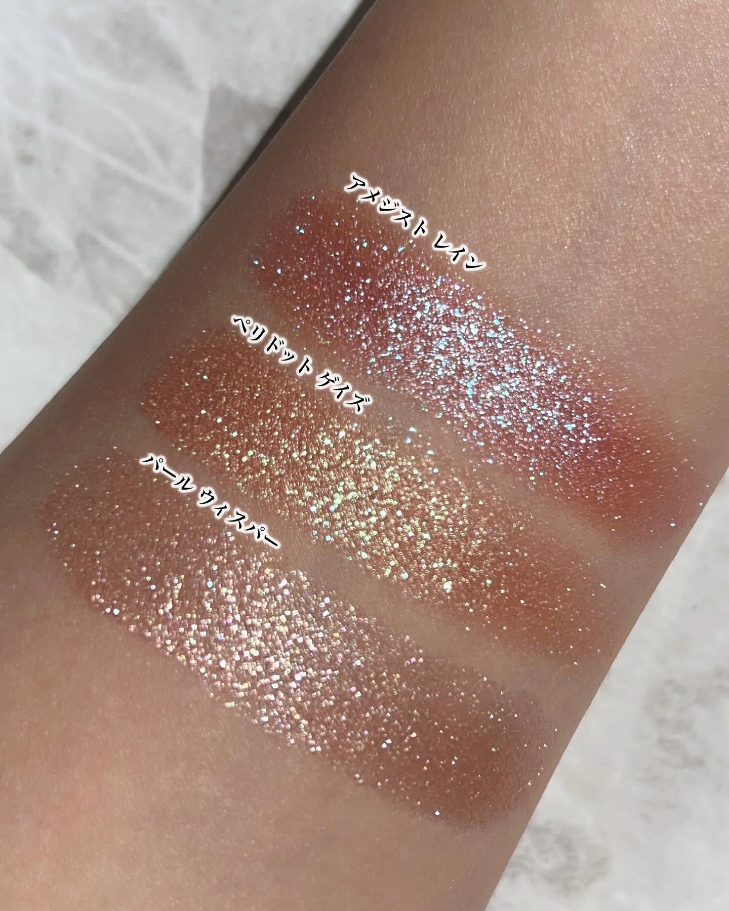 今回の新色は"まぶたに濡れたような光沢を放つ艶、光を操る立体感をプラスしリュクスなまなざしを叶えてくれる"というプリズムフォーミュラ。 確かにいつもとはちょっと違う…良いですこれ🫶❤️ ヌメッと面で光るようなツヤ感✨ テクスチャーは刻印ありタイプ、ツヤはクリームタイプに近いと思います🥰 要は刻印ありとクリームの良いとこ取りですね! ゴールドと柔らかいレッドの組み合わせ。アプレスキーとエレクトリックチェリーの中間のような色合い🤔 ゴールドとピーチカラー。今回の3色の中では一番黄みが強い。 青みがかったローズが可愛い。ぱっと見はわからないけど左上にみんな大好き青ラメが…!!