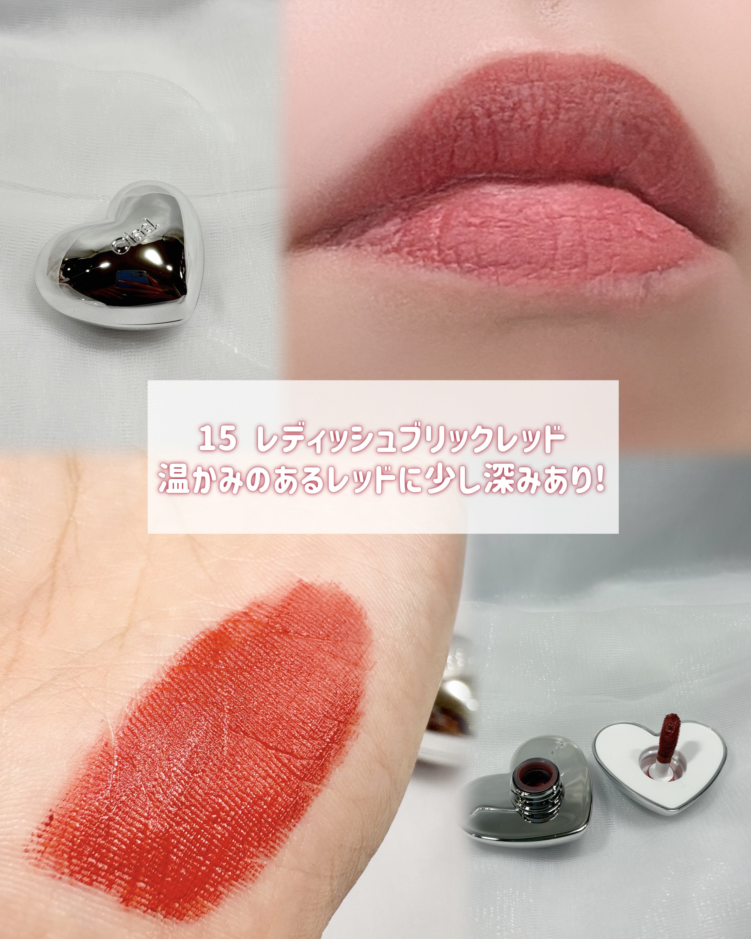 - <01 パーシモンベリー> イソドデカン、オクチルドデカノール、酸化チタン、(ビニルジメチコン/メチコンシルセスキオキサン)クロスポリマー、シリカ、タルク、水添(スチレン/イソプレン)コポリマー、トリ(カプリル酸/カプリン酸)グリセリル、ジメチコン、ポリメチルシルセスキオキサン、ジステアルジモニウムヘクトライト、セスキオレイン酸ソルビタン、(ジメチコン/ビニルジメチコン)クロスポリマー、1,2-ヘキサンジオール、炭酸プロピレン、赤酸化鉄、黄酸化鉄、黄4、香料、赤202、エチルヘキシルグリセリン、黒酸化鉄、赤104(1)、テトラ(ジ-t-ブチルヒドロキシヒドロケイヒ酸)ペンタエリスリチル <02 フロストピン> イソドデカン、オクチルドデカノール、酸化チタン、タルク、(ビニルジメチコン/メチコンシルセスキオキサン)クロスポリマー、シリカ、水添(スチレン/イソプレン)コポリマー、トリ(カプリル酸/カプリン酸)グリセリル、ジメチコン、ポリメチルシルセスキオキサン、ジステアルジモニウムヘクトライト、セスキオレイン酸ソルビタン、(ジメチコン/ビニルジメチコン)クロスポリマー、1,2-ヘキサンジオール、炭酸プロピレン、赤酸化鉄、赤202、香料、黄酸化鉄、エチルヘキシルグリセリン、テトラ(ジ-t-ブチルヒドロキシヒドロケイヒ酸)ペンタエリスリチル <03 ライラックヘイズ> イソドデカン、オクチルドデカノール、酸化チタン、タルク、(ビニルジメチコン/メチコンシルセスキオキサン)クロスポリマー、シリカ、水添(スチレン/イソプレン)コポリマー、トリ(カプリル酸/カプリン酸)グリセリル、ジメチコン、ポリメチルシルセスキオキサン、ジステアルジモニウムヘクトライト、セスキオレイン酸ソルビタン、(ジメチコン/ビニルジメチコン)クロスポリマー、1,2-ヘキサンジオール、炭酸プロピレン、香料、黒酸化鉄、赤202、エチルヘキシルグリセリン、黄酸化鉄、赤酸化鉄、テトラ(ジ-t-ブチルヒドロキシヒドロケイヒ酸)ペンタエリスリチル <04 ヌードダスク> イソドデカン、オクチルドデカノール、酸化チタン、タルク、(ビニルジメチコン/メチコンシルセスキオキサン)クロスポリマー、シリカ、水添(スチレン/イソプレン)コポリマー、トリ(カプリル酸/カプリン酸)グリセリル、ジメチコン、ポリメチルシルセスキオキサン、ジステアルジモニウムヘクトライト、セスキオレイン酸ソルビタン、(ジメチコン/ビニルジメチコン)クロスポリマー、黄酸化鉄、1,2-ヘキサンジオール、炭酸プロピレン、赤酸化鉄、香料、黒酸化鉄、エチルヘキシルグリセリン、テトラ(ジ-t-ブチルヒドロキシヒドロケイヒ酸)ペンタエリスリチル <05 ポニーサーモン> イソドデカン、オクチルドデカノール、酸化チタン、タルク、(ビニルジメチコン/メチコンシルセスキオキサン)クロスポリマー、シリカ、水添(スチレン/イソプレン)コポリマー、トリ(カプリル酸/カプリン酸)グリセリル、ジメチコン、ポリメチルシルセスキオキサン、ジステアルジモニウムヘクトライト、セスキオレイン酸ソルビタン、(ジメチコン/ビニルジメチコン)クロスポリマー、1,2-ヘキサンジオール、炭酸プロピレン、赤酸化鉄、香料、エチルヘキシルグリセリン、黄酸化鉄、黒酸化鉄、テトラ(ジ-t-ブチルヒドロキシヒドロケイヒ酸)ペンタエリスリチル <06 フリップピーチ> イソドデカン、オクチルドデカノール、タルク、酸化チタン、(ビニルジメチコン/メチコンシルセスキオキサン)クロスポリマー、シリカ、水添(スチレン/イソプレン)コポリマー、トリ(カプリル酸/カプリン酸)グリセリル、ジメチコン、ポリメチルシルセスキオキサン、ジステアルジモニウムヘクトライト、セスキオレイン酸ソルビタン、(ジメチコン/ビニルジメチコン)クロスポリマー、黄5、1,2-ヘキサンジオール、炭酸プロピレン、黄酸化鉄、赤酸化鉄、香料、赤202、エチルヘキシルグリセリン、黒酸化鉄、テトラ(ジ-t-ブチルヒドロキシヒドロケイヒ酸)ペンタエリスリチル <07 アプリサン> イソドデカン、オクチルドデカノール、タルク、(ビニルジメチコン/メチコンシルセスキオキサン)クロスポリマー、シリカ、水添(スチレン/イソプレン)コポリマー、トリ(カプリル酸/カプリン酸)グリセリル、ジメチコン、ポリメチルシルセスキオキサン、酸化チタン、ジステアルジモニウムヘクトライト、黄4、赤酸化鉄、セスキオレイン酸ソルビタン、(ジメチコン/ビニルジメチコン)クロスポリマー、1,2-ヘキサンジオール、赤104(1)、炭酸プロピレン、香料、赤202、エチルヘキシルグリセリン、テトラ(ジ-t-ブチルヒドロキシヒドロケイヒ酸)ペンタエリスリチル <08 ローコーラル> イソドデカン、オクチルドデカノール、タルク、(ビニルジメチコン/メチコンシルセスキオキサン)クロスポリマー、シリカ、水添(スチレン/イソプレン)コポリマー、トリ(カプリル酸/カプリン酸)グリセリル、酸化チタン、ジメチコン、ポリメチルシルセスキオキサン、ジステアルジモニウムヘクトライト、セスキオレイン酸ソルビタ