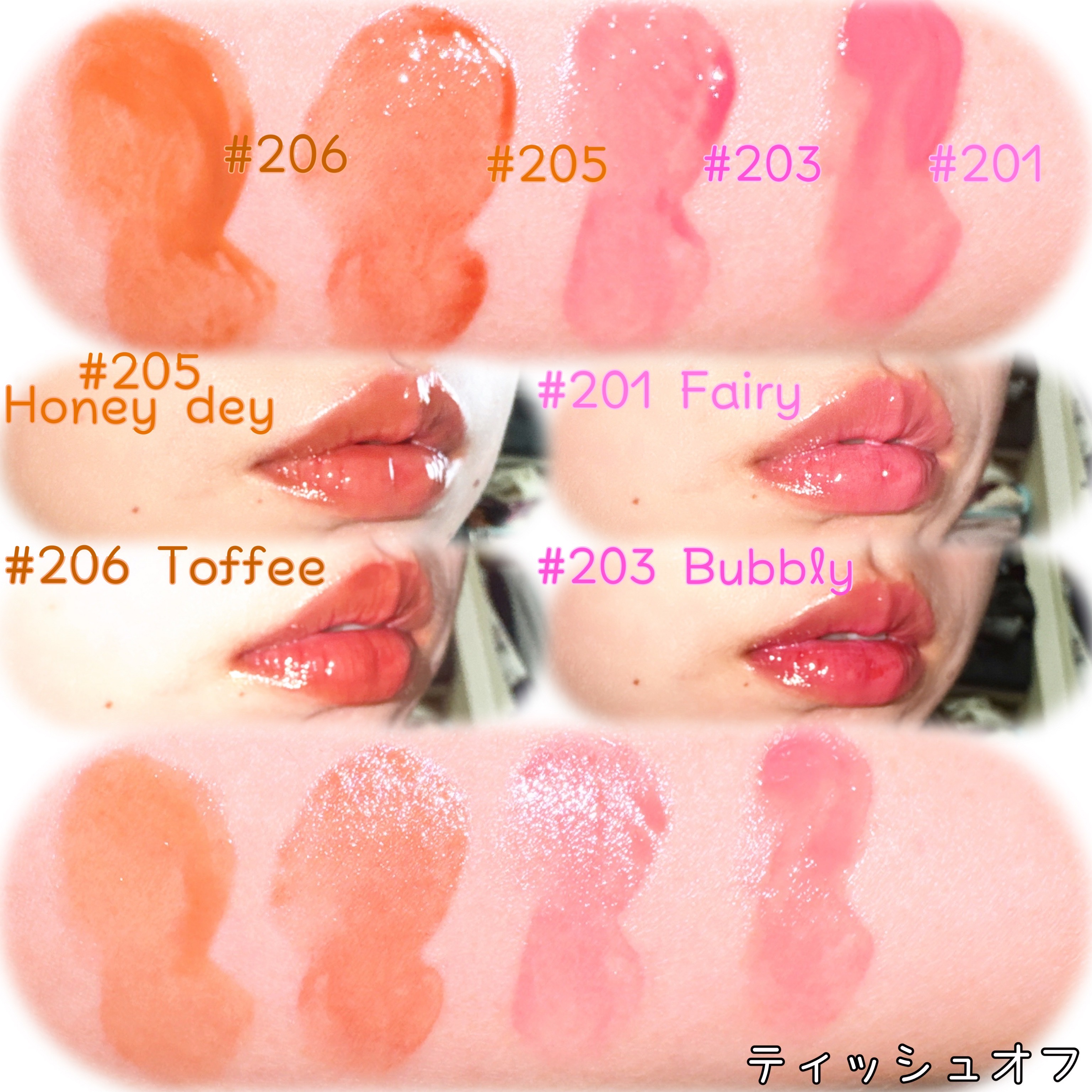 - <201 フェアリー> ダイマージリノール酸ジイソステアリル、ジフェニルシロキシフェニルトリメチコン、ビスジグリセリルポリアシルアジペート-2、水、ジフェニルジメチコン、水添ポリイソブテン、セチルPEG/PPG-10/1ジメチコン、ポリソルベート60、ペンチレングリコール、グリセリン、イソステアリン酸ポリグリセリル-4、フェノキシエタノール、1,2-ヘキサンジオール、セテアレス-20、酸化チタン (CI 77891)、(アクリル酸ヒドロキシエチル/アクリロイルジメチルタウリンNa)コポリマー、ステビオシド、スクワラン、香料、ジラウラミドグルタミドリシンNa、エチルヘキシルグリセリン、エチレンジアミンジコハク酸3Na、赤色227号 (CI 17200)、水酸化Al、黄色5号 (CI 15985)、ポリアクリル酸アンモニウム、イソステアリン酸ソルビタン、黄色4号 (CI 19140)、BG、赤色223号 (CI 45410)、青色1号 (CI 42090)、アラントイン、パンテノール、ツボクサエキス、ヒアルロン酸、加水分解ヒアルロン酸、ヒアルロン酸Na <203 バブリー> ダイマージリノール酸ジイソステアリル、ジフェニルシロキシフェニルトリメチコン、ビスジグリセリルポリアシルアジペート-2、水、ジフェニルジメチコン、水添ポリイソブテン、セチルPEG/PPG-10/1ジメチコン、ポリソルベート60、ペンチレングリコール、グリセリン、イソステアリン酸ポリグリセリル-4、フェノキシエタノール、1,2-ヘキサンジオール、セテアレス-20、(アクリル酸ヒドロキシエチル/アクリロイルジメチルタウリンNa)コポリマー、ステビオシド、酸化チタン (CI 77891)、スクワラン、香料、ジラウラミドグルタミドリシンNa、エチルヘキシルグリセリン、赤色227号 (CI 17200)、エチレンジアミンジコハク酸3Na、黄色5号 (CI 15985)、イソステアリン酸ソルビタン、水酸化Al、ポリアクリル酸アンモニウム、黄色4号 (CI 19140)、BG、青色1号 (CI 42090)、アラントイン、パンテノール、ツボクサエキス、ヒアルロン酸、加水分解ヒアルロン酸、ヒアルロン酸Na <204 レア> ダイマージリノール酸ジイソステアリル、ジフェニルシロキシフェニルトリメチコン、ビスジグリセリルポリアシルアジペート-2、水、ジフェニルジメチコン、水添ポリイソブテン、セチルPEG/PPG-10/1ジメチコン、ポリソルベート60、ペンチレングリコール、グリセリン、イソステアリン酸ポリグリセリル-4、フェノキシエタノール、1,2-ヘキサンジオール、セテアレス-20、(アクリル酸ヒドロキシエチル/アクリロイルジメチルタウリンNa)コポリマー、酸化チタン (CI 77891)、ステビオシド、スクワラン、香料、ジラウラミドグルタミドリシンNa、エチルヘキシルグリセリン、赤色227号 (CI 17200)、黄色5号 (CI 15985)、エチレンジアミンジコハク酸3Na、イソステアリン酸ソルビタン、水酸化Al、ポリアクリル酸アンモニウム、黄色4号 (CI 19140)、青色1号 (CI 42090)、BG、アラントイン、パンテノール、ツボクサエキス、ヒアルロン酸、加水分解ヒアルロン酸、ヒアルロン酸Na <205 ハニーデュー> ダイマージリノール酸ジイソステアリル、ジフェニルシロキシフェニルトリメチコン、ビスジグリセリルポリアシルアジペート-2、水、ジフェニルジメチコン、水添ポリイソブテン、セチルPEG/PPG-10/1ジメチコン、ポリソルベート60、ペンチレングリコール、グリセリン、イソステアリン酸ポリグリセリル-4、フェノキシエタノール、1,2-ヘキサンジオール、セテアレス-20、(アクリル酸ヒドロキシエチル/アクリロイルジメチルタウリンNa)コポリマー、酸化チタン (CI 77891)、ステビオシド、スクワラン、香料、ジラウラミドグルタミドリシンNa、エチルヘキシルグリセリン、赤色227号 (CI 17200)、黄色5号 (CI 15985)、エチレンジアミンジコハク酸3Na、イソステアリン酸ソルビタン、水酸化Al、ポリアクリル酸アンモニウム、黄色4号 (CI 19140)、青色1号 (CI 42090)、BG、アラントイン、パンテノール、ツボクサエキス、ヒアルロン酸、加水分解ヒアルロン酸、ヒアルロン酸Na <206 トフィー> ダイマージリノール酸ジイソステアリル、ジフェニルシロキシフェニルトリメチコン、ビスジグリセリルポリアシルアジペート-2、水、ジフェニルジメチコン、水添ポリイソブテン、セチルPEG/PPG-10/1ジメチコン、ポリソルベート60、ペンチレングリコール、グリセリン、イソステアリン酸ポリグリセリル-4、フェノキシエタノール、1,2-ヘキサンジオール、セテアレス-20、(アクリル酸ヒドロキシエチル/アクリロイルジメチルタウリンNa)コポリマー、ステビオシド、スクワラン、香料、ジラウラミドグルタミドリシンNa、酸化チタン (CI 77891)、エチルヘキシルグリセリン、黄色5号 (CI 15985)、エチレンジアミンジコハク酸3Na、黄色4号 (CI 19140)、赤色227号 (CI 17200)、イソステアリン酸ソルビタン、赤色223号 (CI 45410)、青色1号 (CI 42090)、水酸化Al、ポリアクリル酸アンモニウム、BG、アラントイン、パンテノール、ツボクサエキス、ヒアルロン酸、加水分解ヒアルロン酸、ヒアルロン酸Na <207 フレイム> ダイマージリノール酸ジイソステアリル、ジフェニルシロ