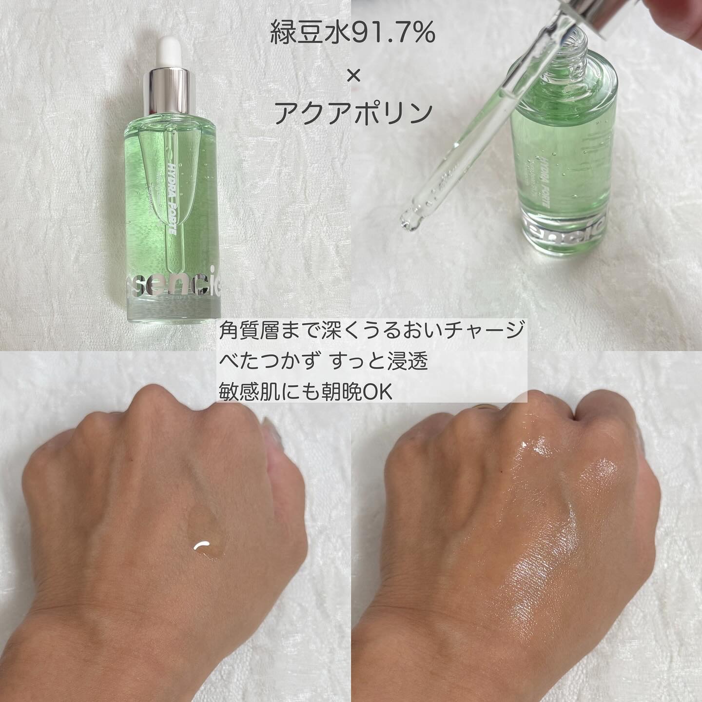 - 91.7%の高濃度緑豆エキス*1、隅々*2まで保湿を維持するアクアポリン*1配合の美容液 美容保湿成分を肌の隅々*2まで届けるナノリポソーム技術を採用 *1保湿成分 *2角質層まで