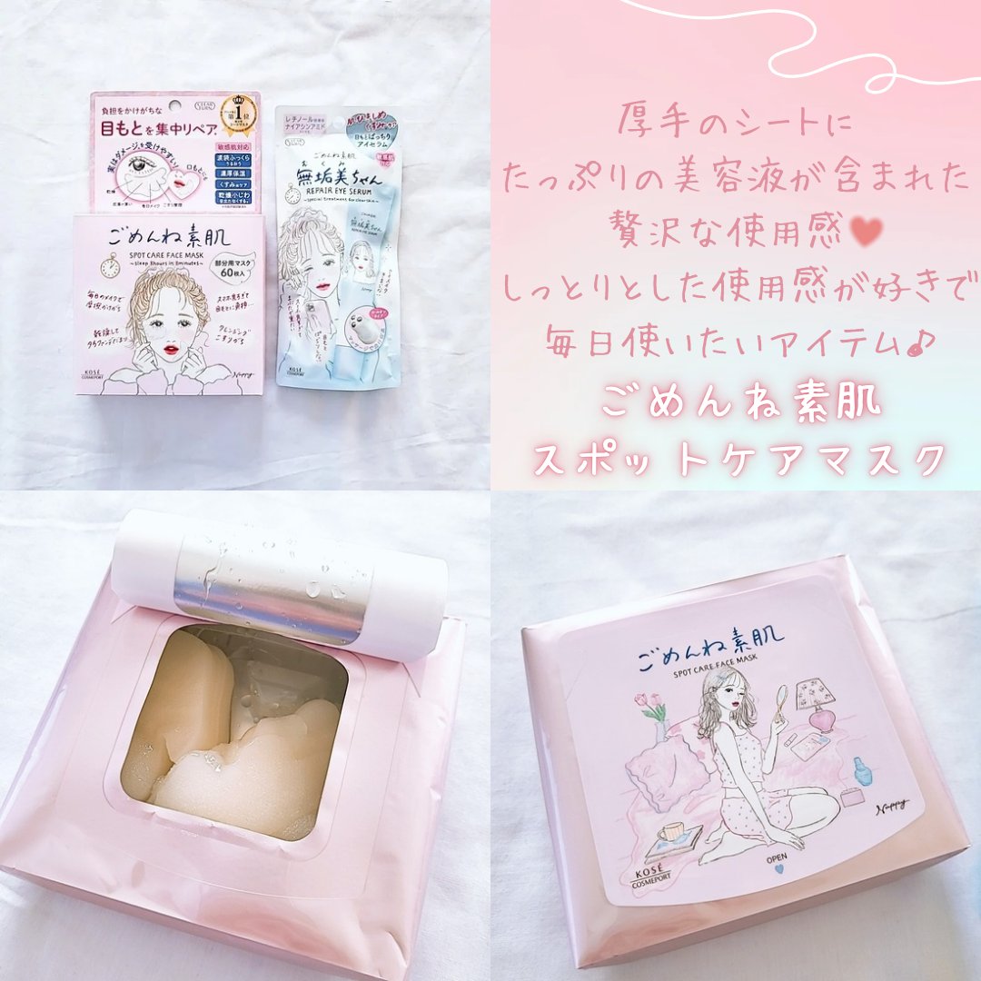 ✔ごめんね素肌スポットケアマスク部分用マスクで、特に目もとなどのデリケートな部分に使える集中ケアアイテム♡♡厚手でしっかり密着する素材の羽根型シートで、折り返してCゾーンにも使える工夫があり、目もとにフィット🥰たっぷりの美容液で使用後は目元の...