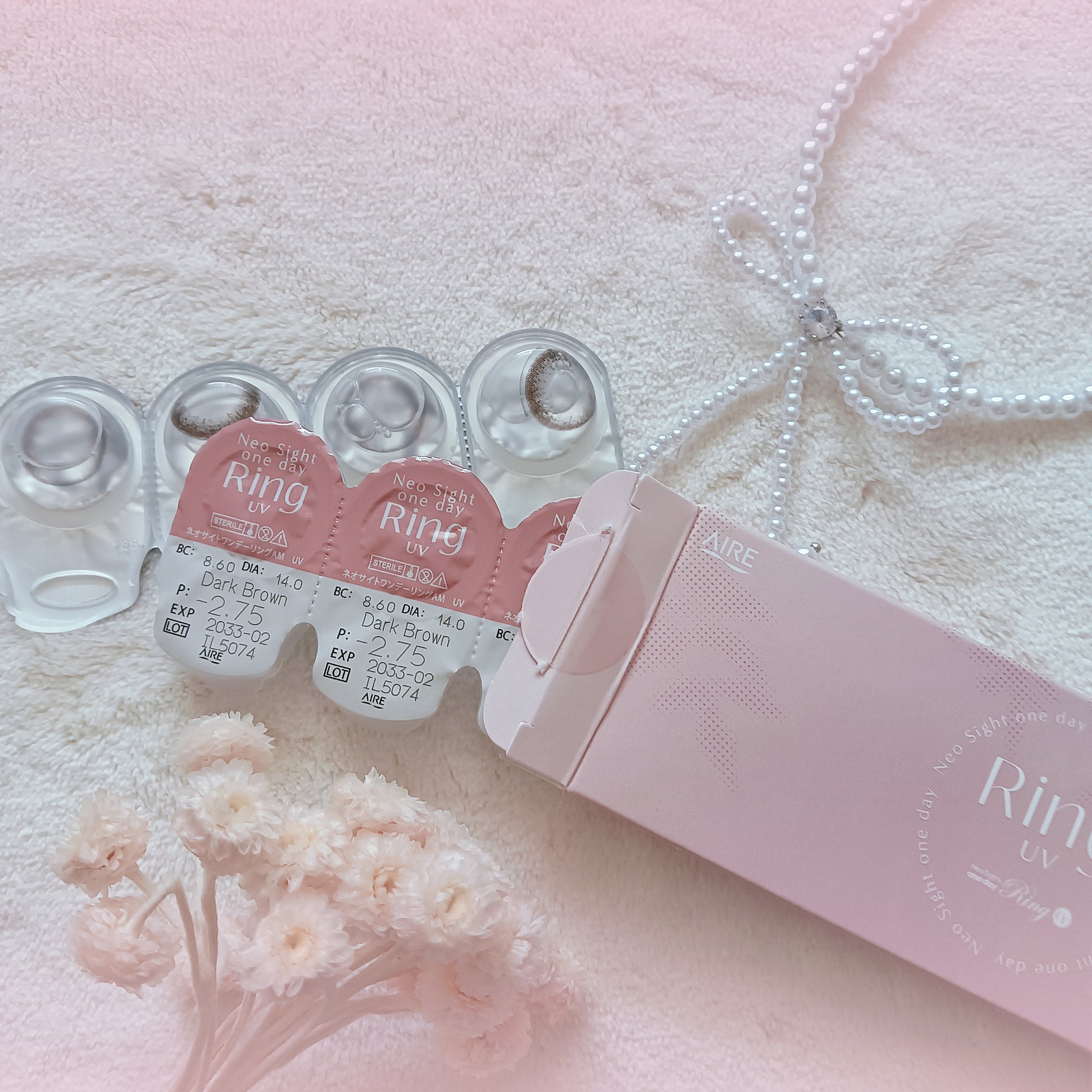 - ①瞳になじむシンプルデザイン&カラー 新色のモーヴブラウンを加え、ダークブラウン&ライトブラウン&ブラウン&ブラックの5色をラインナップ。 ナチュラルな雰囲気を大切にするため、学校や仕事など、いつもの生活でもさりげなく使っていただけるサイズにこだわりました。また、レンズ着色部の内径も大きくデザインされているので、視界をさえぎることはありません。 ②うるおいたっぷり長持ち ネオサイトワンデー リングUVは、ヒアルロン酸浸漬レンズの約2倍の保水力があるので、1日中快適。その秘密はうるおい成分「MPCポリマー」。 MPCポリマーが潤いのヴェールとなってレンズをやさしく包み込むため、瞳にもやさしく、涙のうるおいが長くつづきます。眼の乾きによるゴロゴロした違和感を感じることなく、ご使用いただけます。 ③有害な紫外線をカット 紫外線が日焼けの原因になることがよく知られているように、眼も紫外線によってダメージを受けます。深刻な場合は、眼の老化だけでなく眼障害を引き起こす危険性もあるのです。紫外線の気になる夏はもちろん、それ以外の季節も眼を紫外線から守ることはとても大事です。ネオサイトワンデー リングUVはUV吸収剤を配合なので、有害な紫外線をカットできます。 ④含有率42.5% なめらかなつけ心地 装用感と乾燥感のバランスを考え、水分を適度に多く含む素材(含水率42.5%)を新たに採用。乾燥しにくさはキープしつつ、よりなめらかなつけ心地に。さらに、タンパク質などの汚れがつきにくい非イオン性の素材を使用しているので、朝から晩まで快適なつけ心地が続きます。 ※装用感には個人差があります。 ⑤色素が直接目に触れない カラーレンズは瞳に負担がかかりそう、なんて思われがちですが、ネオサイトワンデー リングUVはレンズ素材で着色部分を包み込んだ、Wrap-In構造。色素がまぶたや角膜などに直接触れないので、安心してお使いいただけます。 ⑥汚れにくい非イオン性 低含水率、非イオン性の素材を使用しているので、タンパク質などの汚れがつきにくいレンズです。朝から晩まで、快適な見え方を保ちます。 また、形状保持にすぐれているので、つけ外しが簡単です。 ⑦毎日清潔、新品レンズ 1日使い捨てだから、いつも清潔。面倒なレンズケアも必要ありません。レンズはいつも清潔でみずみずしいので、安心してお使いいただけます。