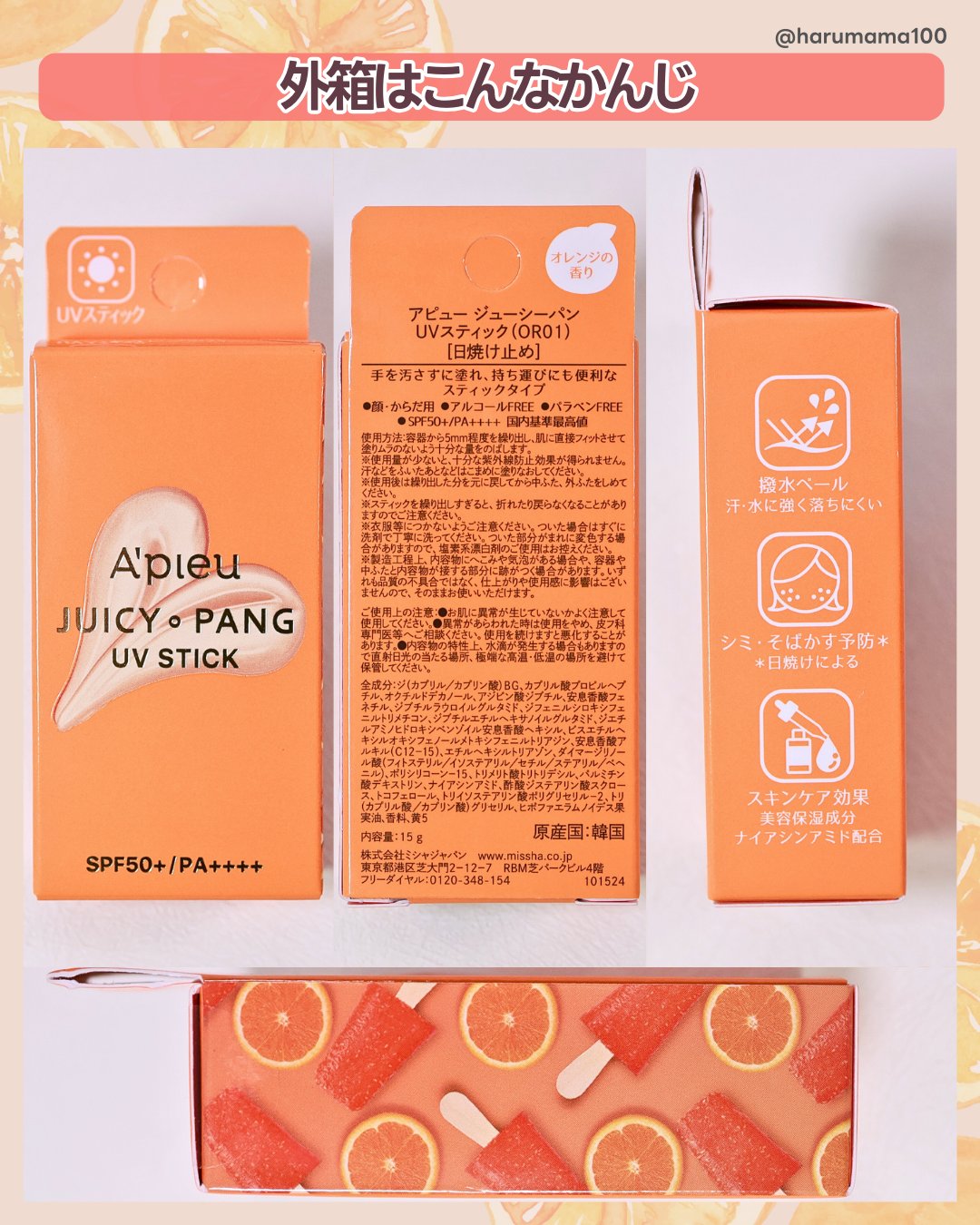 - 選べる3種の「香り」と「カラー」でジューシーな果実感が楽しめるUVスティック。 SPF50+/PA++++の国内最高基準値。 撥水ベールにより汗水に強い高い撥水力を実現。 透明スティックだから衣服や手を汚さず、白浮きしにくく素肌感を残したナチュラルなツヤ肌へと導きます。 さらさらオイルが配合されていることにより、摩擦の少ないマイルドタッチでなめらかな塗り心地。 ベタつきやきしみを感じにくい使用感が特徴です。 美容保湿成分ナイアシンアミドや、各種ごとに異なる果実由来の保湿成分を配合。 コンパクト設計のため持ち運びがしやすく、お出かけ先など気になったらどこでもUVケアが可能。 さらにメイクの上からも使え、日中の塗り直しにも便利です。
