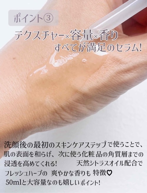 | 少しとろみがあるけど肌に出すとすーっと垂落ちてくるくらいのゆるめのテクスチャーで、のびが良い! | 詳細を見る | |