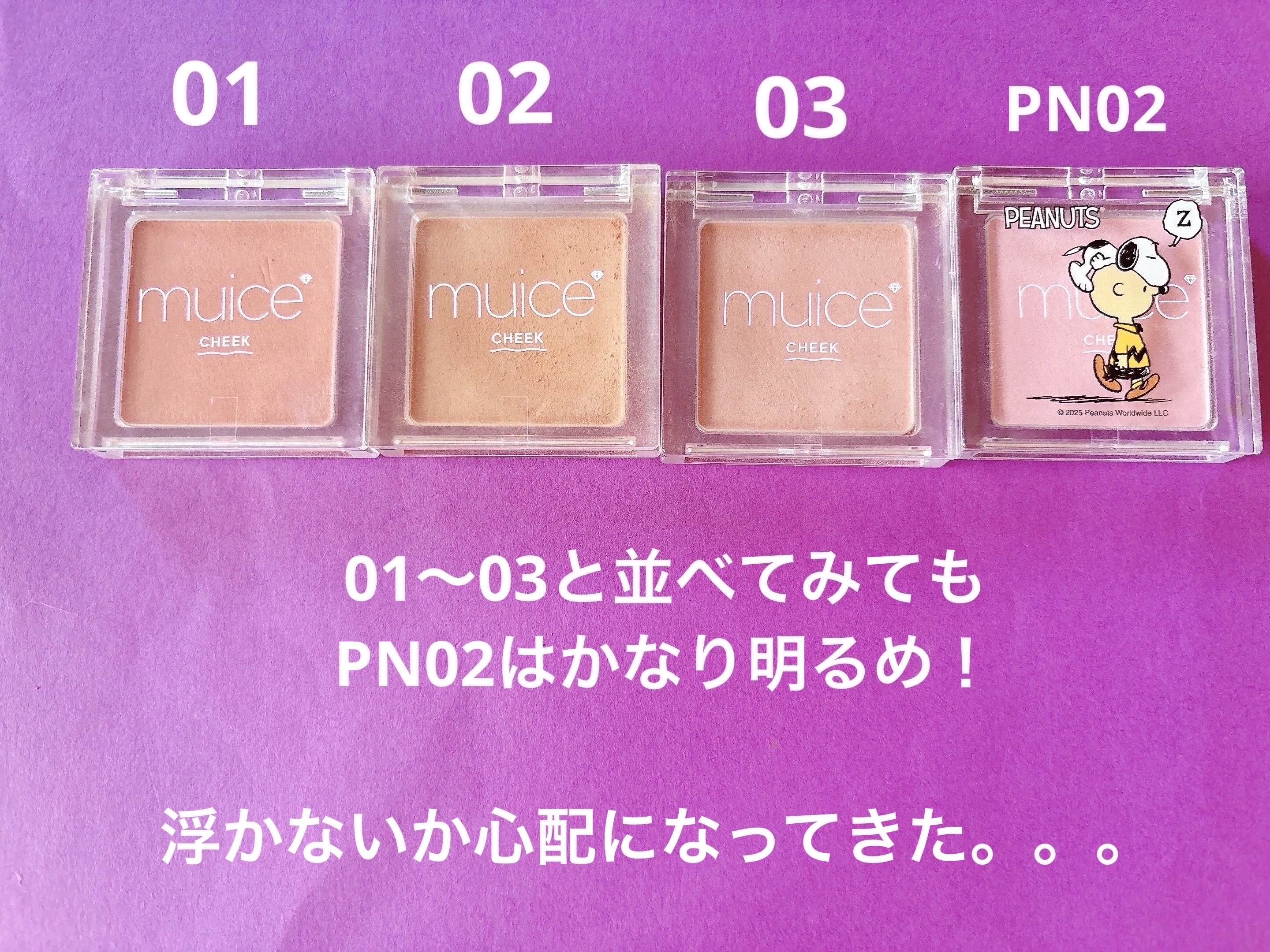 muiceぽわんチークPN01コットンメロリーナPN02ベビメロピンク限定ピーナッツコラボ¥990どちらも既存色より明るめカラーふんわりした発色で使いやすい!PN01は白みがかったオレンジでナチュラルな血色感出してくれる!既存の02を明るくし...