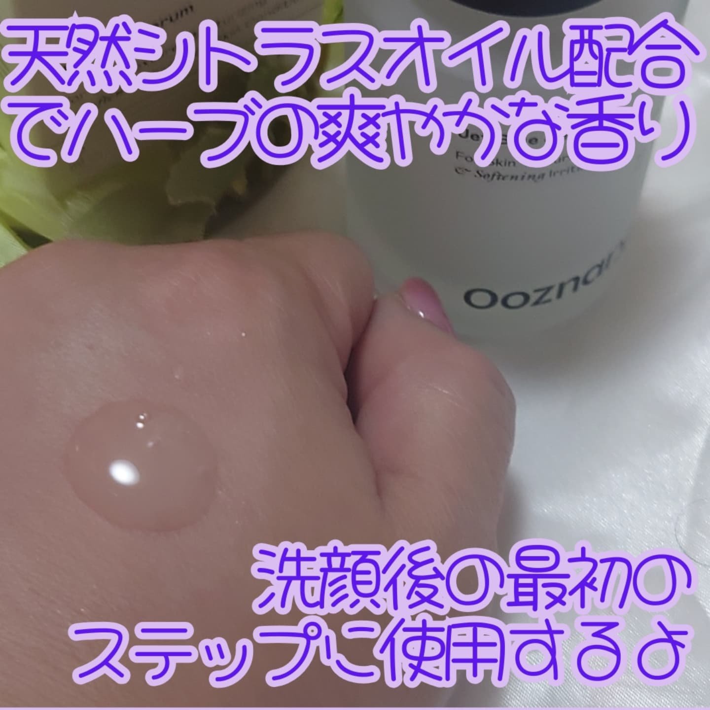 Ooznaryジェットブルーセラムをお試しさせていただきました。まろやかなとろみのあるテクスチャー。すっと伸び広がり、さらりとなじんでくれます。肌なじみが良く、べたつかないので使いやすいです。爽やかな良い香りがお気に入り!50mlと大容量なの...