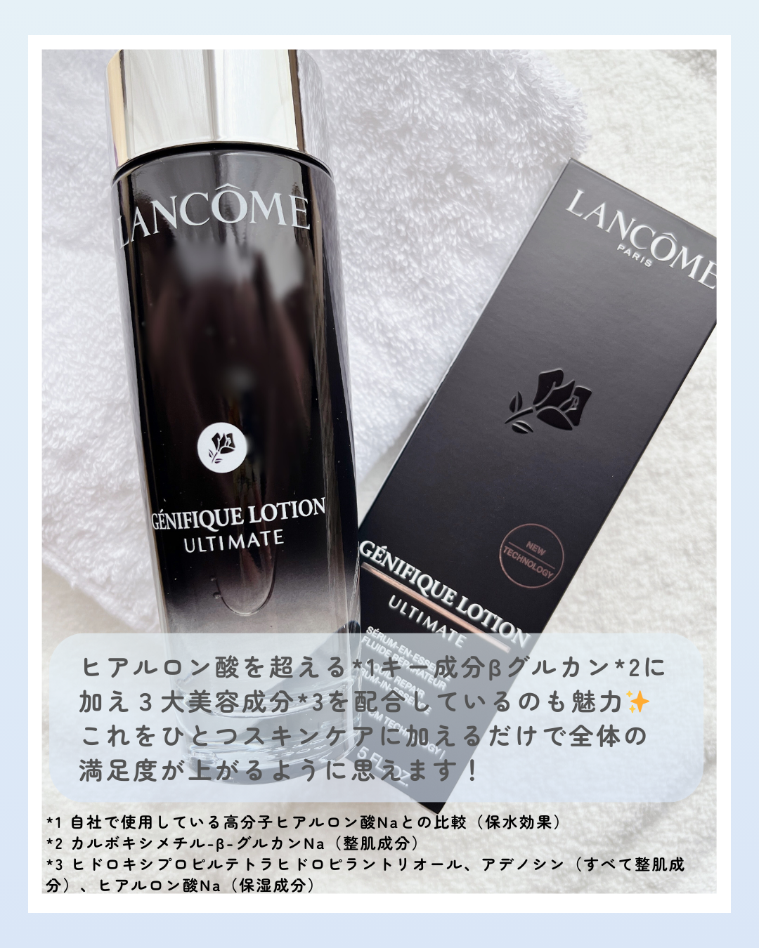 あの「ジェニフィック」から化粧水が誕生ですˎˊ˗LANCOMEジェニフィックアルティメエッセンスローションヒアルロン酸を超える*1キー成分βグルカン*2に加え3大美容成分*3を配合している化粧水です୨୧夏の終わりかけの時期ってうるおい不足やハ...