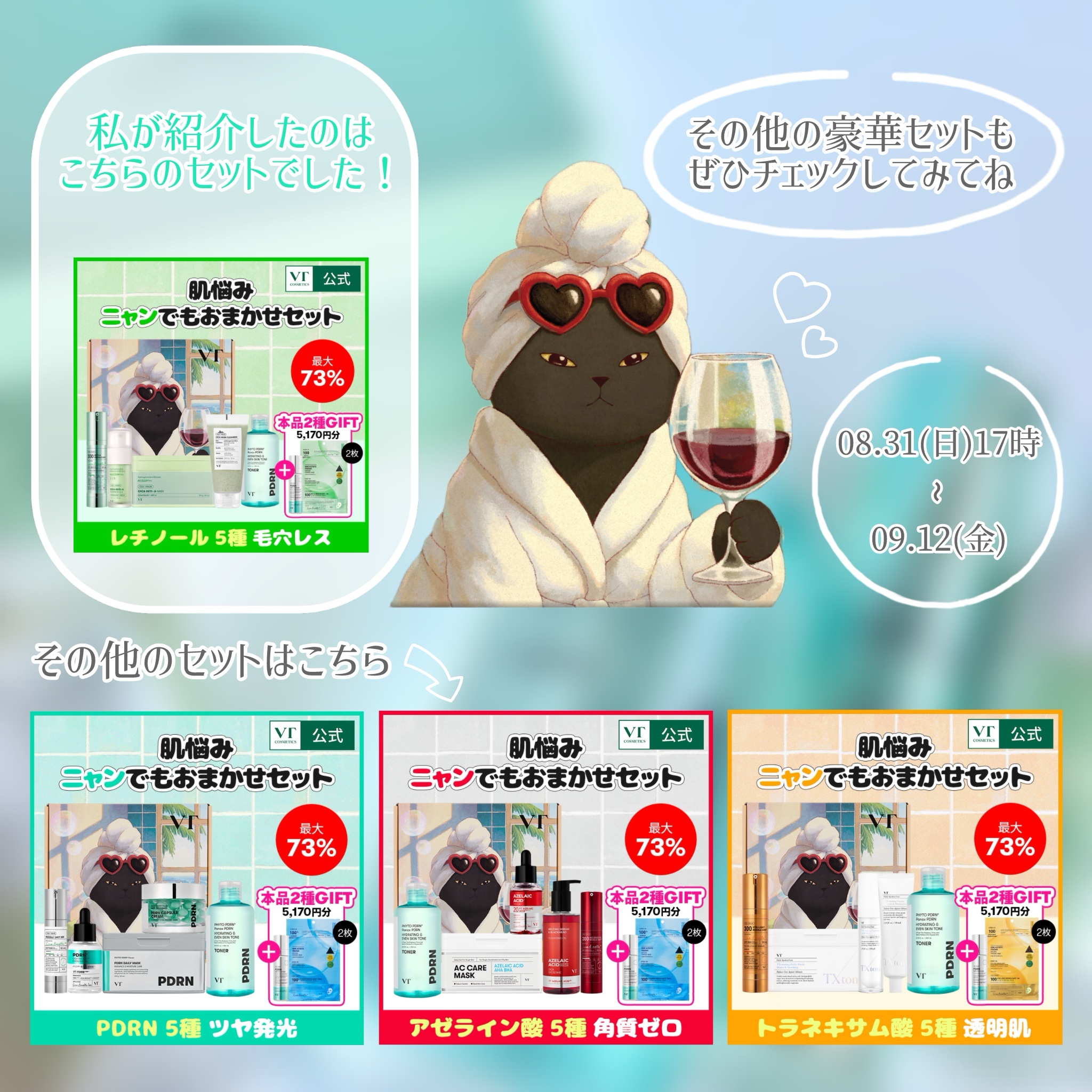 \ニャンでもおまかせ🐈🐈⬛/@VT毛穴が気になる方必見❣️❣️8月31日からはじまるQoo10メガ割でお得すぎるセットが出るぞ🉐📣!その名も、🐈【VT肌悩みニャンでもおまかせセット】🐈⬛悩みに合わせた4種類のセットが販売されるんだけど今回...
