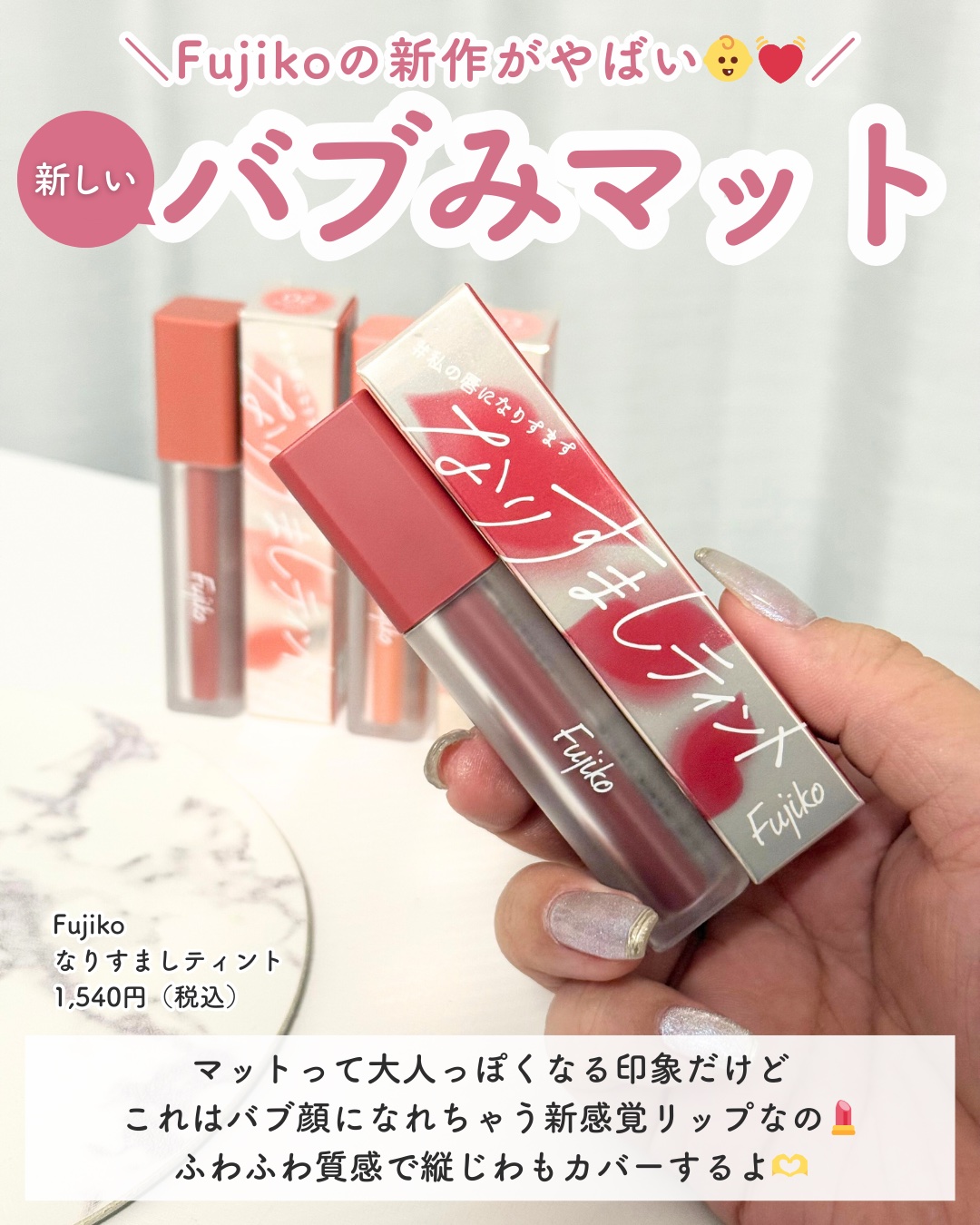 フジコなりすましティント01私のレッド美人で大人っぽい華やかレッド3種類の保湿成分配合で内側にしっとりうるおいを感じる新感覚マット♡色移りしにくいロングラスティングでとりあえず塗るだけで素の唇になりすましたような血色感とふんわりとした発色が長...