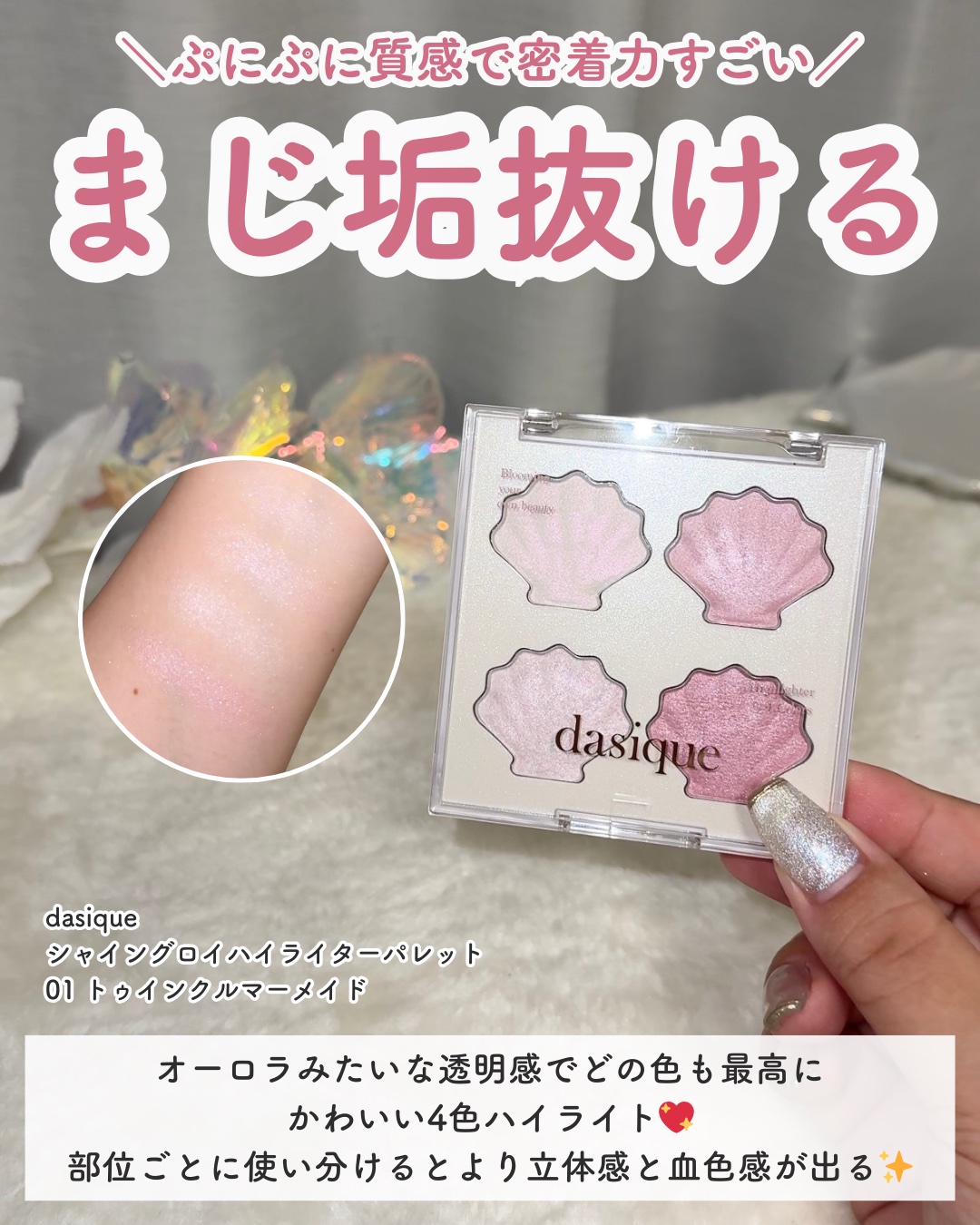 メガ割おすすめ❤️🔥パケ買い不可避😭❕dasiqueハイライターパレット01トゥインクルマーメイドマーメイドラインが可愛いすぎる🥹全部揃えたくなっちゃうビジュでテクスチャは柔らかく使い心地も◎置いているだけでも可愛い🐚デイジークVカットブレ...