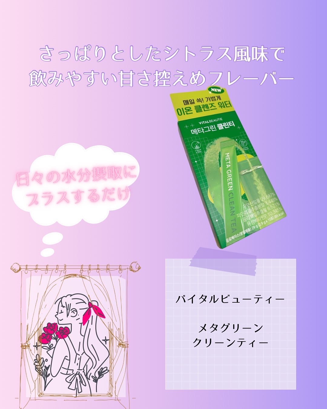バイタルビューティーのメタグリーンクリーンティー@powderroom_jp_event@vitalbeautie_official食事の後にぴったりの、さわやかなレモン風味のクリーンティーです。ヴィーガンの方でも飲めるのが嬉しいポイント。毎...