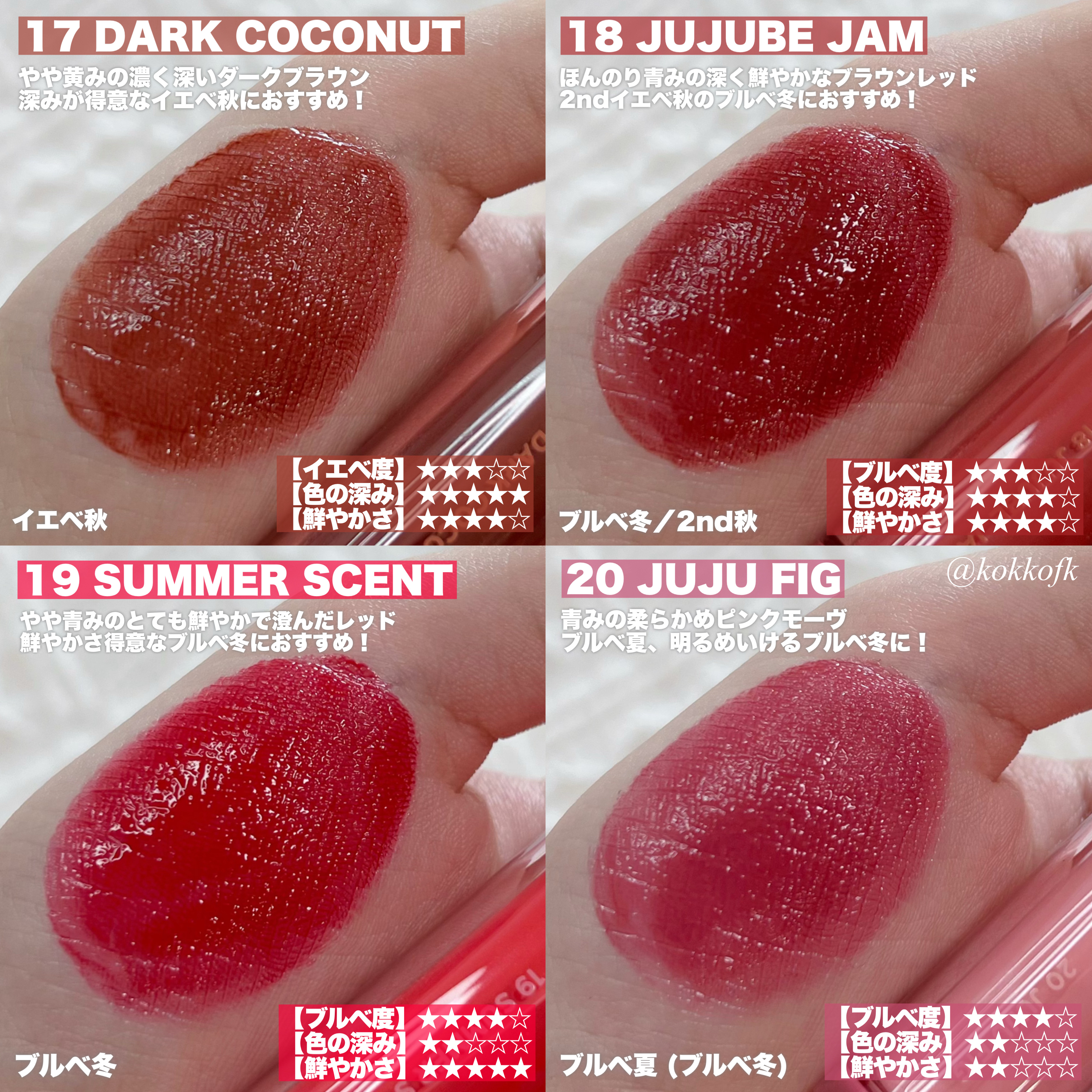既存のジューシーラスティングティントよりさらに軽いツヤ感が魅力の新作ティント! 色選びの参考にしてね! やや黄みの明るいオレンジコーラル鮮やか得意なイエベ春におすすめ! 黄みの明るくまろやかなオレンジベージュ黄みが得意なイエベ春におすすめ! 青み黄み中間なくすみピンクベージュブルベ夏やイエベ春におすすめ 黄みの深くて鮮やかなオレンジレッド鮮やか得意なイエベ秋におすすめ! 青みの鮮やかで明るいビビッドピンク明るさ得意なブルベ冬やブルベ夏におすすめ! 青みの明るめで柔らかいローズピンクブルベ夏やブルベ冬におすすめ! 青み黄み中間な鮮やかで強いビビッドレッド2ndイエベ春のブルベ冬におすすめ! 青みの強い深くて鮮やかなベリーレッド2nd夏で鮮やか得意なブルベ冬におすすめ!