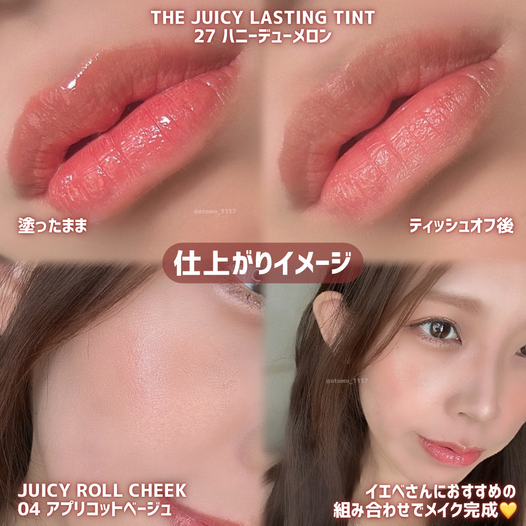 ロムアンド@romandyou様よりご提供rom&nd◇ジューシーロールチーク04アプリコットベージュ◆ジューシーラスティングティント27ハニーデューメロンチークはころんとしたフォルムが可愛い✨ふわっと透ける感じでじゅわっと血色感プラスしてく...