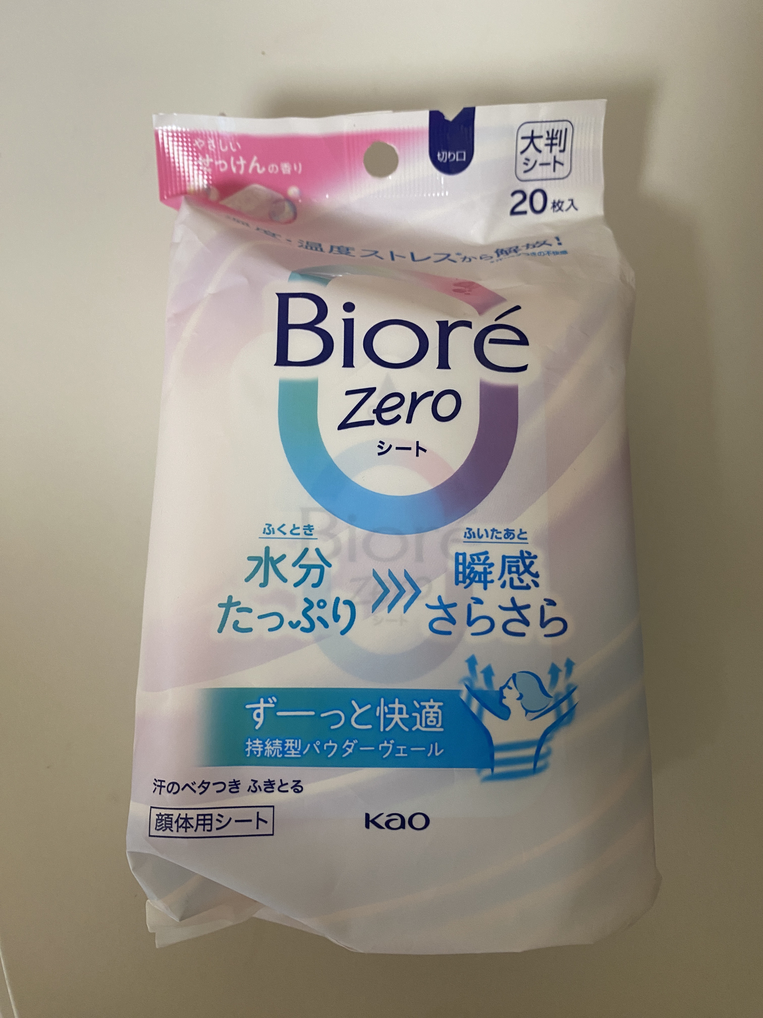 【使った商品】 ビオレZero シート やさしいせっけんの香り 20枚入り ¥550 【商品の特徴】 持続型パウダーヴェールで、快適続く ふくとき水分たっぷり、ふいたあと瞬感さらさら 1枚で全身ふける大判シート(230×200mm) やさしいせっけんの香り 【使用感】 大判で拭きやすい 厚みもあるので全身とはいえないけど、上半身は拭いた面を変えながらでも全部拭ける せっけんの香りもよい 【良いところ】 ドラストでもどこでも買える 20枚入りだと他の大容量より少ないと思うけど、大判で厚みあるから何枚も使わなくてよくてコスパいい 今年の夏でリピート2個目でストックも買ってある 【イマイチなところ】 開け閉めする接着部分が使ってるうちにちゃんと閉まらなくなる