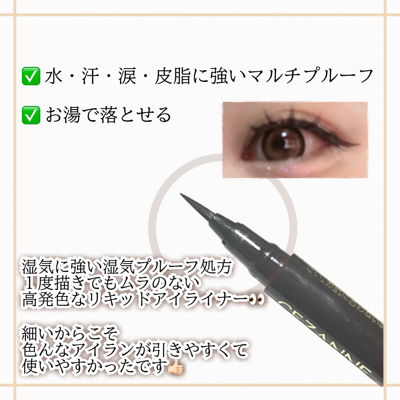 リピしてる超オススメアイライナーです!! ウォータープルーフ、湿気にも強くてお湯offOK🙆♀️ 極細なので失敗しずらい、跳ね上げも完璧にかける、下まつ毛めちゃくちゃ描きやすい!!! しかも嬉しいプチプラ、安心と信頼のCEZANNE😌