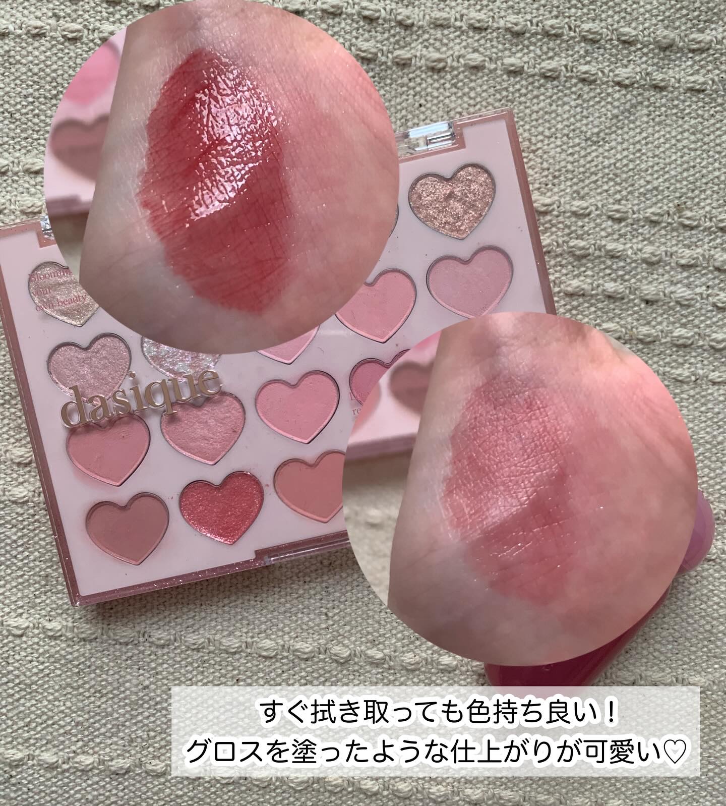 右上のピンクは時短したい時などに大活躍で、アイシャドウやチークにも使えますよ🩷 質感が綺麗だから、時短メイクに見えなくてお気に入りのカラーです! 001番も持ってるけど、やっぱりこっちの方が使用頻度高い😂 それくらいお気に入りコスメです🫶🏻