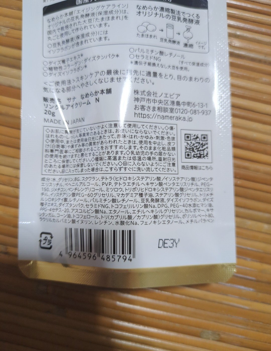 - ピュアレチノール※を新配合!濃厚アイクリームでもっちりハリeyes ※ 保湿成分 「リンクルアイクリーム N」は、『なめらか本舗』オリジナルの豆乳発酵液*1に加え、ピュアレチノール*1とビタミンE誘導体*2を新配合したもっちりとしたハリのある目元に導く「アイクリーム」です。 密着ポリマーがお肌の上で均一な膜を形成し、目元のハリ感をサポート。 毎日のスキンケアに取り入れていただくことで、年齢の出やすい目元をしっかりケアします。 〔①ピュアレチノール*1×豆乳発酵液*1×ビタミンE誘導体*2配合〕 「なめらか本舗」オリジナルのイソフラボン含有の豆乳発酵液*1に加え、ピュアレチノール*1を新配合。 さらに、ビタミンE誘導体(TPNaⓇ)*2も配合し、年齢の出やすい目元をしっかりケアします。 ・ピュアレチノール:ビタミンAの一種でハリのある目元に! ・豆乳発酵液:弾力感・うるおいを与えふっくらした目元に! ・ビタミンE誘導体(TPNaⓇ):お肌にぐんぐん浸透*3してイキイキした目元に! 〔②密着ポリマーで目元にハリ感〕 密着ポリマーがお肌の上で均一な膜を形成します。もっちりとハリのある目元に導きます。 *1 保湿成分 *2 トコフェリルリン酸Na(保湿成分) *3 角層まで