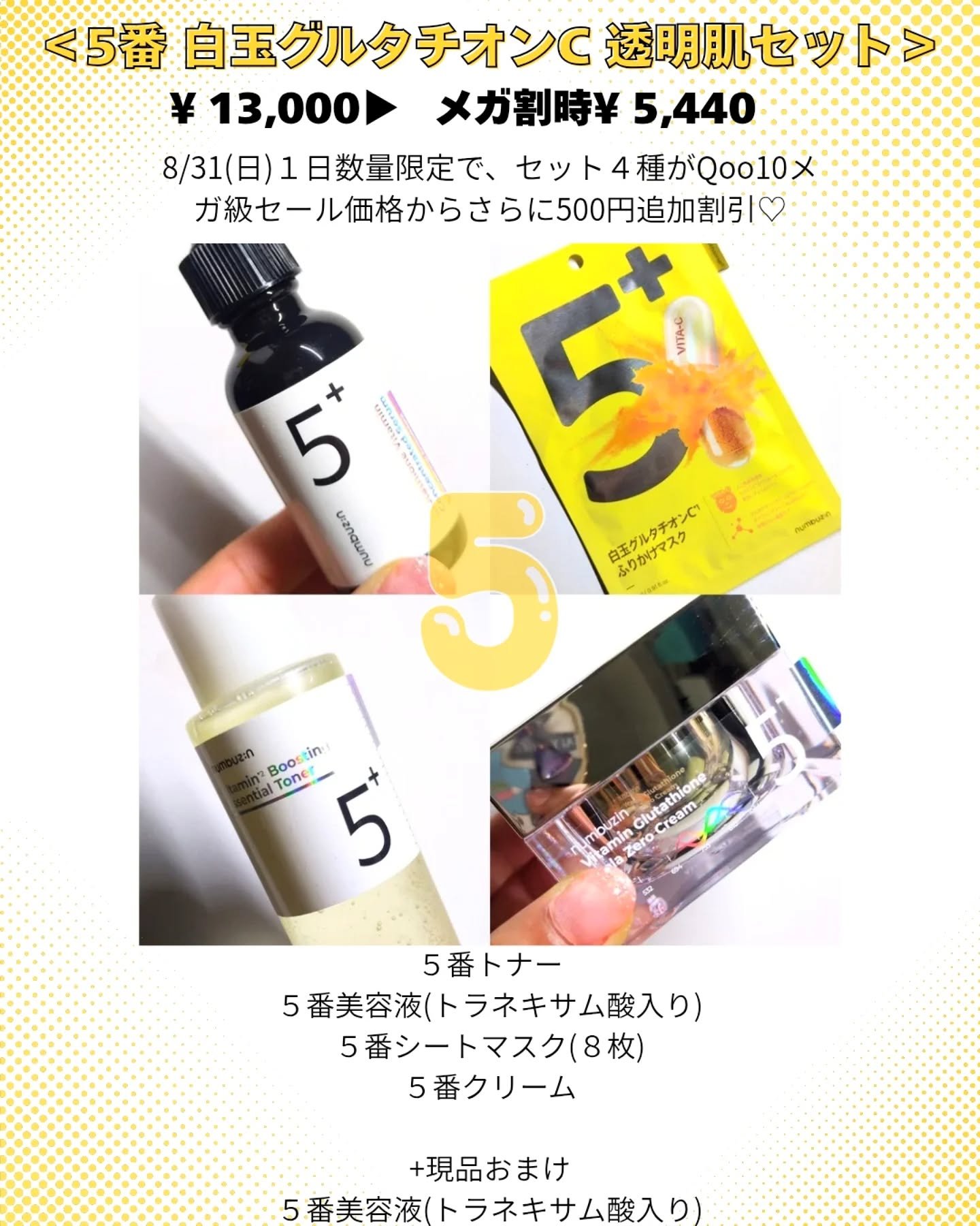 ..メガ割おすすめ!numbuzinの5番白玉グルタチオンC透明肌セット⛄️🫧\セット内容/5番トナー5番美容液(トラネキサム酸入り)5番シートマスク(8枚)5番クリーム+現品おまけ5番美容液(トラネキサム酸入り)通常価格13,000円のセッ...