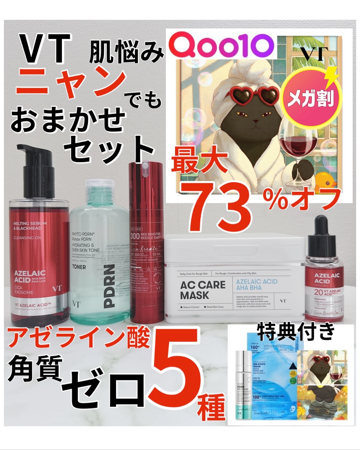 VTQoo10メガ割り限定発売!肌悩みニャンでもおまかせセット🐈⬛✨最大割引73%👀✨メガ割で販売される超お得な価格のBOXセット▪️アゼライン酸セット(アゼライン酸角質ゼロセット)高純度アゼライン酸を使ったスキンケアセット...