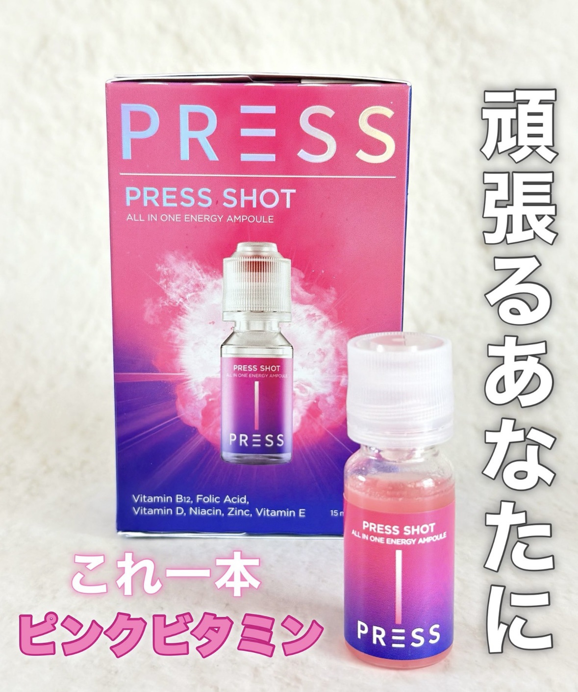 - ・PRESSしてSHAKEするだけ!魔法のようなピンクビタミンに! ・飲むインナービューティー ・飲むピンクビタミン ・粉末にはビタミン B12/D/E、葉酸、ナイアシン、亜鉛が含まれています ・吸収力を重視した液状タイプでの商品設計 ・特許取得の特殊キャップにビタミンを真空密封 ・ビタミンB群を集中配合 ・ビタミンB12は1日の基準値に対し16,667%配合 ・液体は11種類のアミノ酸で吸収しやすい設計 ・飲む瞬間にキャップを押す⇒ビタミンが液体に混ざりフレッシュなビタミンドリンクが完成! 【注意事項】 ・高カルシウム血症がある場合、または医薬品を服用されている方は専門家に相談してください。 ・体に異変を感じた場合は使用を中止し、速やかに専門家に相談してください。 ●本品は、多量摂取により疾病が治癒したり、より健康が増進するものではありません。 亜鉛の摂り過ぎは、銅の吸収を阻害するおそれがありますので、過剰摂取にならないよう注意してください。一日の摂取目安量を守ってください。乳幼児・小児は本品の摂取を避けてください。 ●本品は、特定保健用食品と異なり、消費者庁長官による個別審査を受けたものではありません。 ●食生活は、主食、主菜、副菜を基本に、食事のバランスを。 ●本品製造工場では卵、小麦、そば、落花生、えび、かに、くるみを含む製品を製造しています。 ●摂取目安量:1日当たり1本を目安にお飲みください。 ●摂取の方法:キャップを押すと粉末が落ちます。上下に振り、混ぜてからお飲みください。※粉末が固まる場合がございますが、品質には問題ありません。よく振ってからお飲みください。 2024年12月中旬より全国のウエルシア薬局とロフト※にて先行販売をいたします。 ※一部お取り扱いがない店舗がございます。