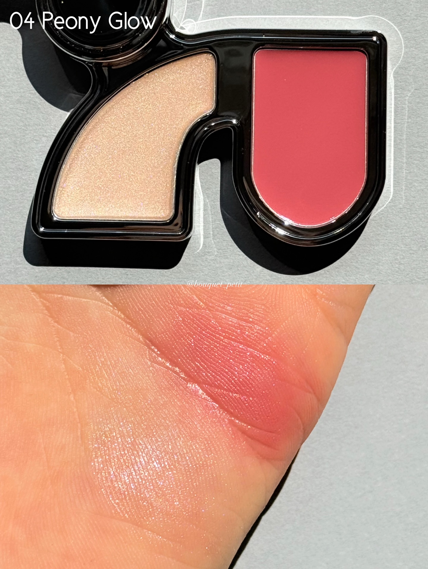 先ずこれは4カラー全てに言えることですが、指で直塗りしちゃうとギランギランになるので、ブラシでふわっとのせるのが良いです。 02はグリッターのような輝きのある、ハイライターというより大粒ラメ。 04は偏光ピンクパールが可愛すぎる🩷 粉質はどれも柔らかいので使いやすいですよ! 私個人としては1番使いやすいのは04です。 ラメが非常に細かい+ 偏光ピンクカラーが上品な艶感を演出。 02に関しては、fweeのダイヤモンドチークと似ていて、ラメが大きくシルバー系の輝きのため、涙袋用のブラシで目頭等にのせています。 03はチークとして使ってます。 チークにラメが入っていると考えれば、時短です笑 コーラル系ピンクですが、ブルベでも可愛く発色しましたよ❤️