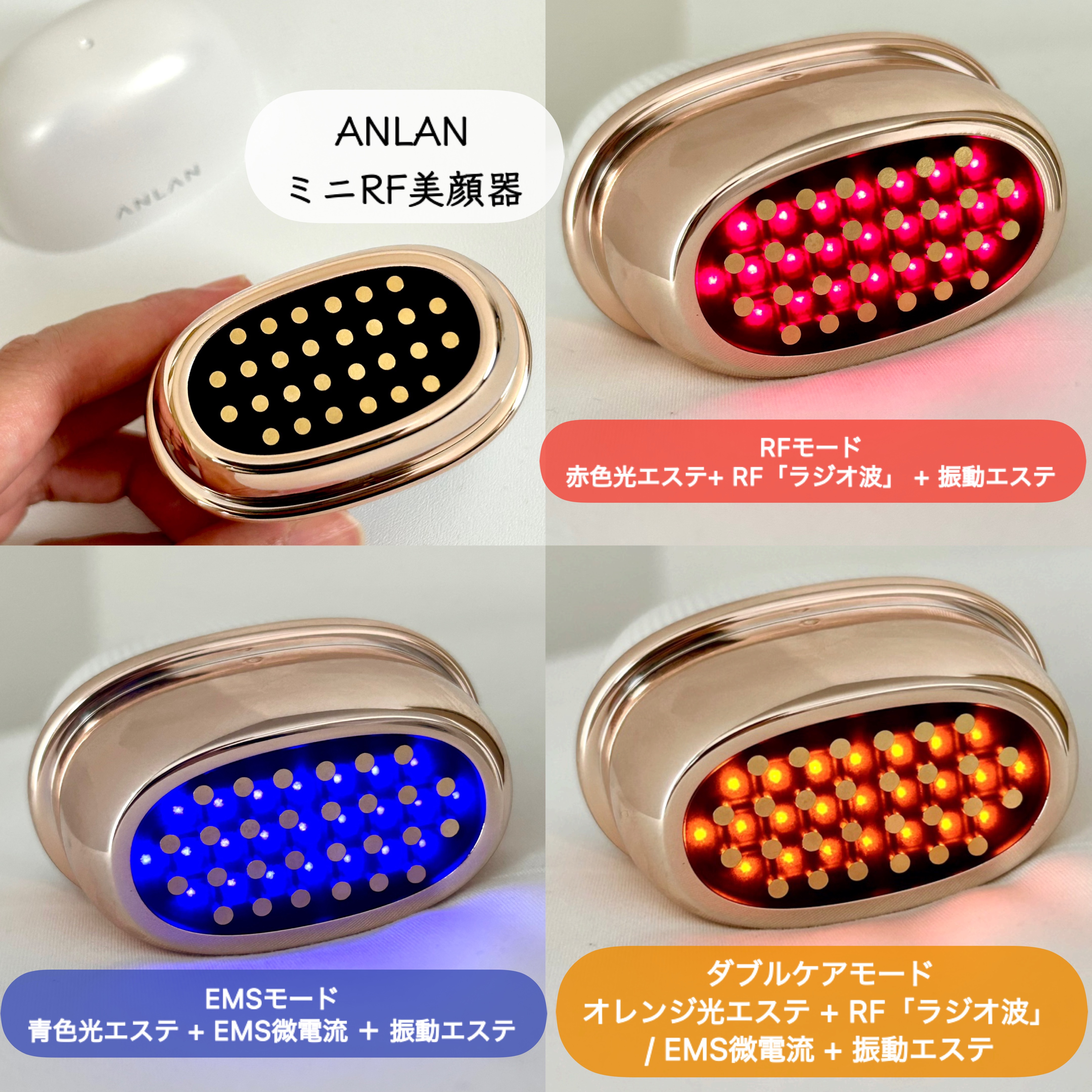- ・1台9役! 徹底的にエイジングケア RF美顔器! 1.引き上げ感のあるケア 2.ハリ感のサポート 3.肌のキメを整えるケア 4.うるおい感の向上 5.古い角質によるくすみケア 6.表情筋のトレーニング 7.メイクノリの良い肌へ 8.つややかな肌印象へ 9.乾燥による小じわを目立たなくするケア 進化したRF(ラジオ波)機能と独自のPMRテクノロジー 26個の金メッキRF接触点と23個のLED美容ライトを搭載したマルチポーラ式金めっきヘッドにより、RF(ラジオ波)の温熱を効率よく角質層や皮下まで届け、肌をじんわりと温めます。 さらに、ANLAN独自のPMRテクノロジーを搭載。ハイブリッド波形と低周波数パルス電流、1MHzの固定周波数RFを組み合わせることで、角質層まで美容成分の浸透をサポートし、日常のスキンケアをさらに効果的にします。 EMS表情筋トレーニング機能で肌の引き締め感ケア 28個の金メッキEMS接触点と、最大約1.3万回の振動エステにより、複雑に絡み合う表情筋を効率的にトレーニングし、肌の引き上げ感をサポートします。EMS体感は従来品より40%UPし、3段階のレベル調節が可能です。前頭筋、眼輪筋、小頬骨筋、頬筋、口角下制筋といった年齢サインが気になる5つの部位にアプローチします。 ・肌に優しいヘッド形状と持ち運びやすさ 引き上げ感のあるケアをしやすい形状を追求したヘッドは、凹凸感を抑えた平らな電極を採用。摩擦による肌への負担を抑えながら、年齢サインが気になる口元やフェイスラインにしっかり密着し、効果的なケアをサポートします。 また、わずか146gと軽量で小型デザインのため、携帯に便利です。メイク前のスキンケアにも最適で、肌にハリを与え、キメを整えることで、メイクノリが良くなります。 ・IPX6防水仕様でお手入れも簡単 IPX6相当の防水性能を備えているため、使用後のお手入れも簡単で衛生的です。 ・ 3つのモードで全顔をトータル美肌ケア ①RFモード(週3回、10分間/回) 1MHz高周波RFの温熱が、乾燥小じわやハリ不足、古い角質によるくすみなどにアプローチ。 赤色光エステと振動エステも同時出力し、肌をじんわりと温め、ケアをサポートします。 ②EMSモード(2日に1回、5~10分間/回) EMS微電流と振動エステで表情筋にアプローチし、肌の引き締め感を目指します。 青色光エステも同時に働きかけ、肌コンディションを整え、うるおい、なめらかさ、しなやかさのある肌へ導きます。弾力感とハリのある肌印象へ。 ③ダブルケアモード(2日に1回、5~10分間/回) RF(ラジオ波)の温熱とEMSによる筋肉へのアプローチを同時に行い、肌の内側と外側からの多角的なケアで、より引き上げ感のある状態が期待できます。 オレンジ光エステと振動エステも併用することで、気になる肌のコンディションに素早く働きかけます。 *ANLANエピジェルやシートマスクとの併用がおすすめです。 ③ダブルケアモード(2日に1回、5~10分間/回) RF(ラジオ波)の温熱とEMSによる筋肉へのアプローチを同時に行い、肌の内側と外側からの多角的なケアで、より引き上げ感のある状態が期待できます。 オレンジ光エステと振動エステも併用することで、気になる肌のコンディションに素早く働きかけます。 23個の3色LED美容ライト(赤色約615-650nm、青色約450-480nm、オレンジ色約600-610nm)が、スキンケアしながら先進的な光美容ケアを実現し、ご自宅で手軽に美肌効果を実感いただけます。