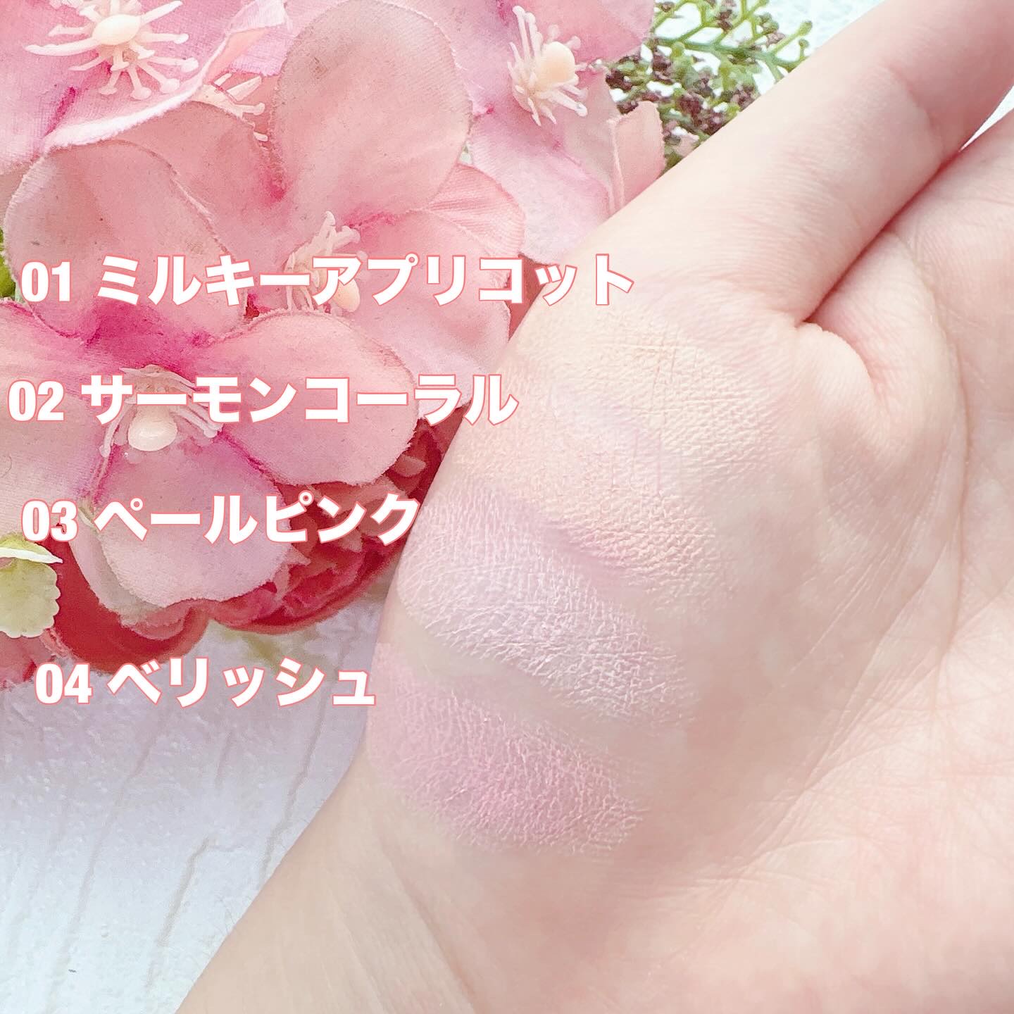 - <01 ミルキーアプリコット> タルク、オキシ塩化ビスマス、合成フルオロフロゴパイト、シリカ、ジヘプタン酸ネオペンチルグリコール、ナイロン-12、ステアリン酸亜鉛、ポリメチルシルセスキオキサン、酸化チタン、イソステアリン酸水添ヒマシ油、ジ安息香酸PG、ジメチコン、ジフェニルシロキシフェニルトリメチコン、フェニルトリメチコン、黄4、トリエトキシカプリリルシラン、1,2-ヘキサンジオール、酸化鉄、エチルヘキシルグリセリン、カプリル酸グリセリル、水酸化Al、赤226、酸化スズ <02 サーモンコーラル> タルク、オキシ塩化ビスマス、合成フルオロフロゴパイト、シリカ、ジヘプタン酸ネオペンチルグリコール、ナイロン-12、ステアリン酸亜鉛、ポリメチルシルセスキオキサン、酸化チタン、イソステアリン酸水添ヒマシ油、ジ安息香酸PG、ジフェニルシロキシフェニルトリメチコン、フェニルトリメチコン、ジメチコン、トリエトキシカプリリルシラン、1,2-ヘキサンジオール、黄4、エチルヘキシルグリセリン、酸化鉄、カプリル酸グリセリル、水酸化Al、赤226、グンジョウ、酸化スズ <03 ペールピンク> タルク、オキシ塩化ビスマス、合成フルオロフロゴパイト、シリカ、酸化チタン、ジヘプタン酸ネオペンチルグリコール、ナイロン-12、ステアリン酸亜鉛、ポリメチルシルセスキオキサン、イソステアリン酸水添ヒマシ油、ジ安息香酸PG、ジメチコン、ジフェニルシロキシフェニルトリメチコン、フェニルトリメチコン、トリエトキシカプリリルシラン、1,2-ヘキサンジオール、エチルヘキシルグリセリン、酸化鉄、カプリル酸グリセリル、水酸化Al、赤226、酸化スズ <04 ベリッシュ> タルク、オキシ塩化ビスマス、合成フルオロフロゴパイト、シリカ、ジヘプタン酸ネオペンチルグリコール、ナイロン-12、酸化チタン、ステアリン酸亜鉛、ポリメチルシルセスキオキサン、イソステアリン酸水添ヒマシ油、ジ安息香酸PG、ジメチコン、ジフェニルシロキシフェニルトリメチコン、フェニルトリメチコン、トリエトキシカプリリルシラン、1,2-ヘキサンジオール、水酸化Al、黄4、エチルヘキシルグリセリン、赤226、カプリル酸グリセリル、グンジョウ、酸化鉄