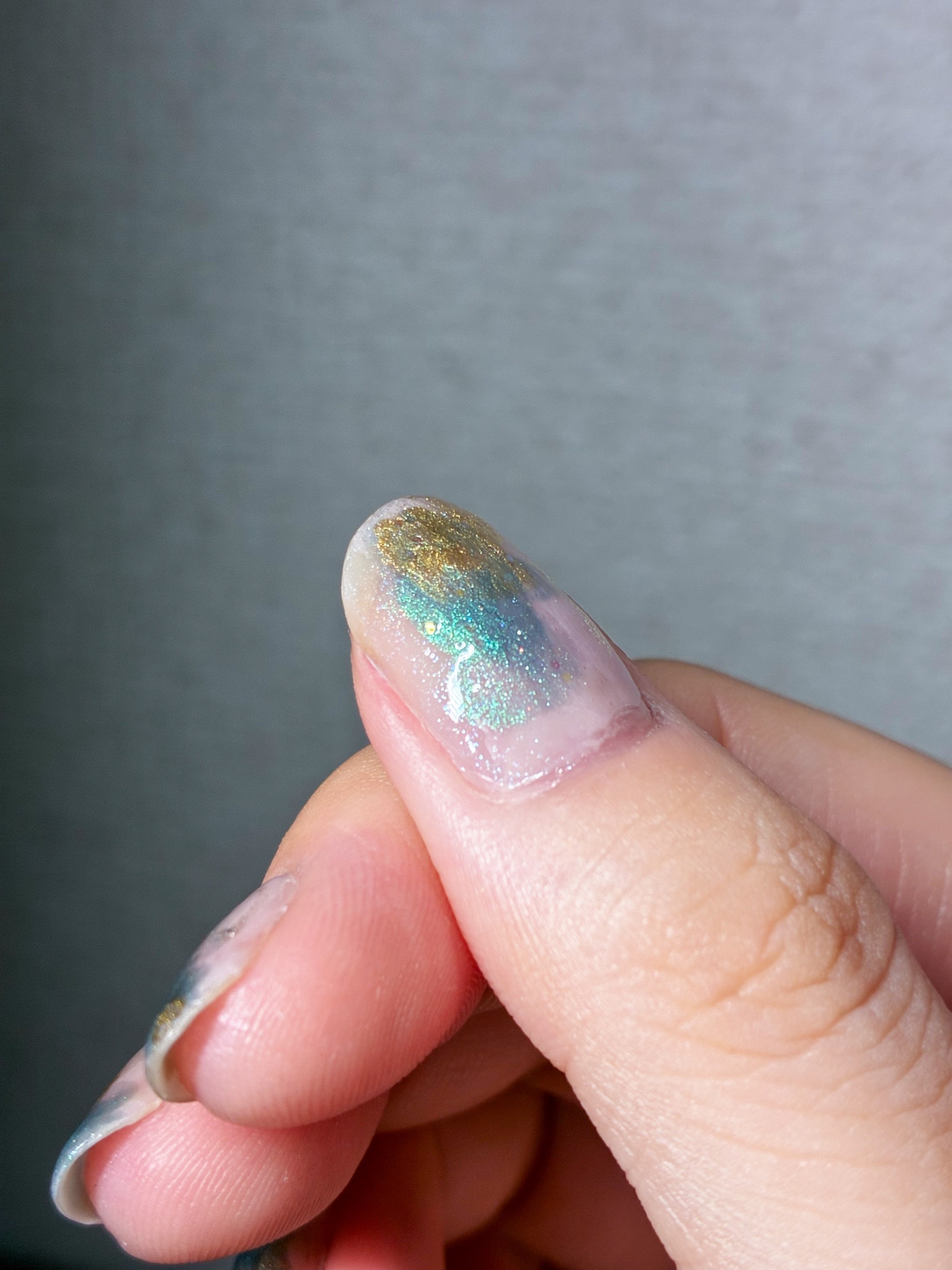 明日おでかけするので!ネイルし直し💅モネの絵画のような(特に睡蓮みたいな)雰囲気にしたかったのです🥹ちょっと掛け離れちゃったけど、これはこれで可愛いので🙆♀️N82クラウドレススカイをベースにいろんなポリを塗って重ねました。限定色のラメと偏...
