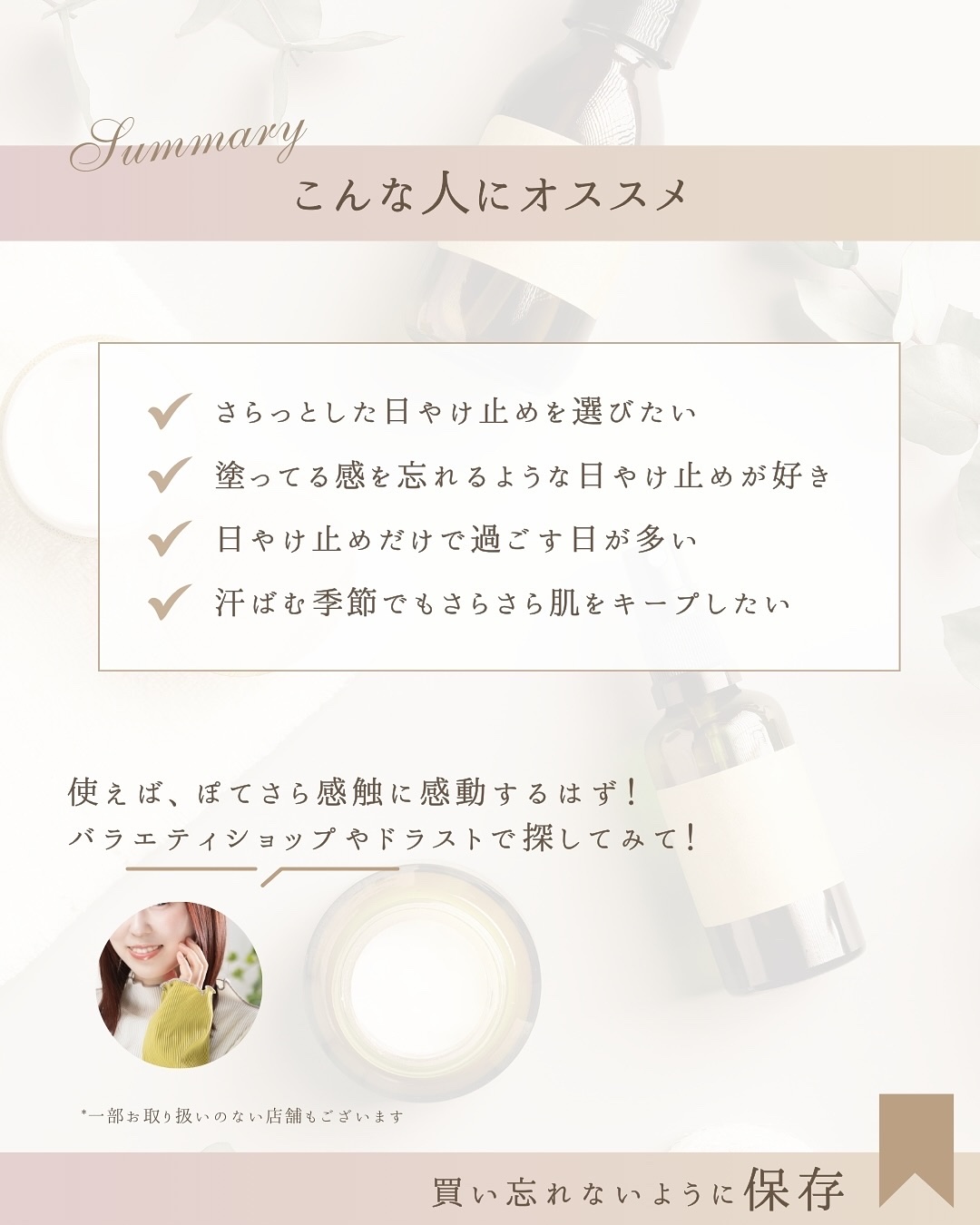 | 日焼け止め・UVケアランキング第50位 | 少し硬めで「ぽてっ」としたテクスチャーで、肌に馴染ませると「さらっ」とした質感になる“ぽてさらテクスチャー”となっています | 詳細を見る | |
