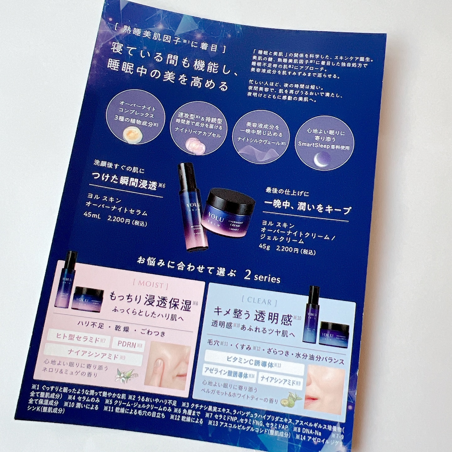 YOLUヨルスキンオーバーナイトクリームモイストオーバーナイトセラムモイストオーバーナイトジェルクリームクリアオーバーナイトセラムクリア¥2,200睡眠と美肌の関係を科学したスキンケアが登場🌙💙保湿に特化したmoistと透明感*のあるお肌に導...
