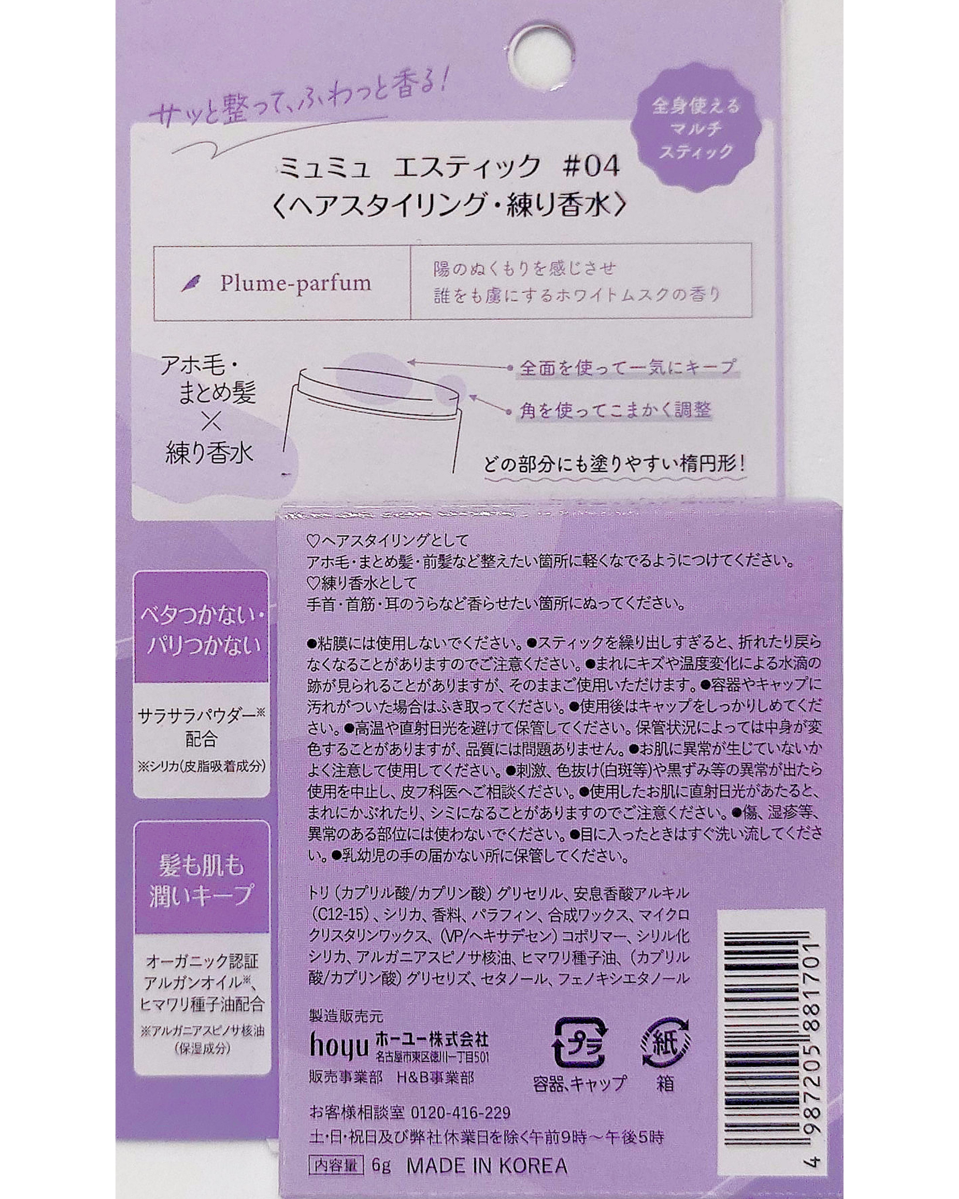 - ① 使いやすい楕円形のスティック 可愛いコロンとしたフォルムのスティックは、使いやすさも優秀。 横にして広範囲のアホ毛やまとめ髪を一気に整えたり、縦にして細かい前髪の調整をしたり、全方位隙なし髪を簡単に作れちゃいます♡ ② 練り香水としても使える 厳選されたこだわりの4種のフレグランスは是非試してほしいポイント。体温の高い手首や首筋・耳の後ろに付けるのがおススメ。動くたびにリッチな香りがふわっと広がります。 ③ 髪と肌に嬉しい使用感 オーガニック認証アルガンオイル※1とひまわり種子油を保湿成分としてダブルで配合。乾燥しがちな髪と肌の潤いをキープします。また、さらさらパウダー※2を配合。ベタつかない、パリつかない使い心地で使い続けたくなる使用感を目指しました。 ※1:アルガニアスピノサ核油 ※2:シリカ(皮脂吸着成分)