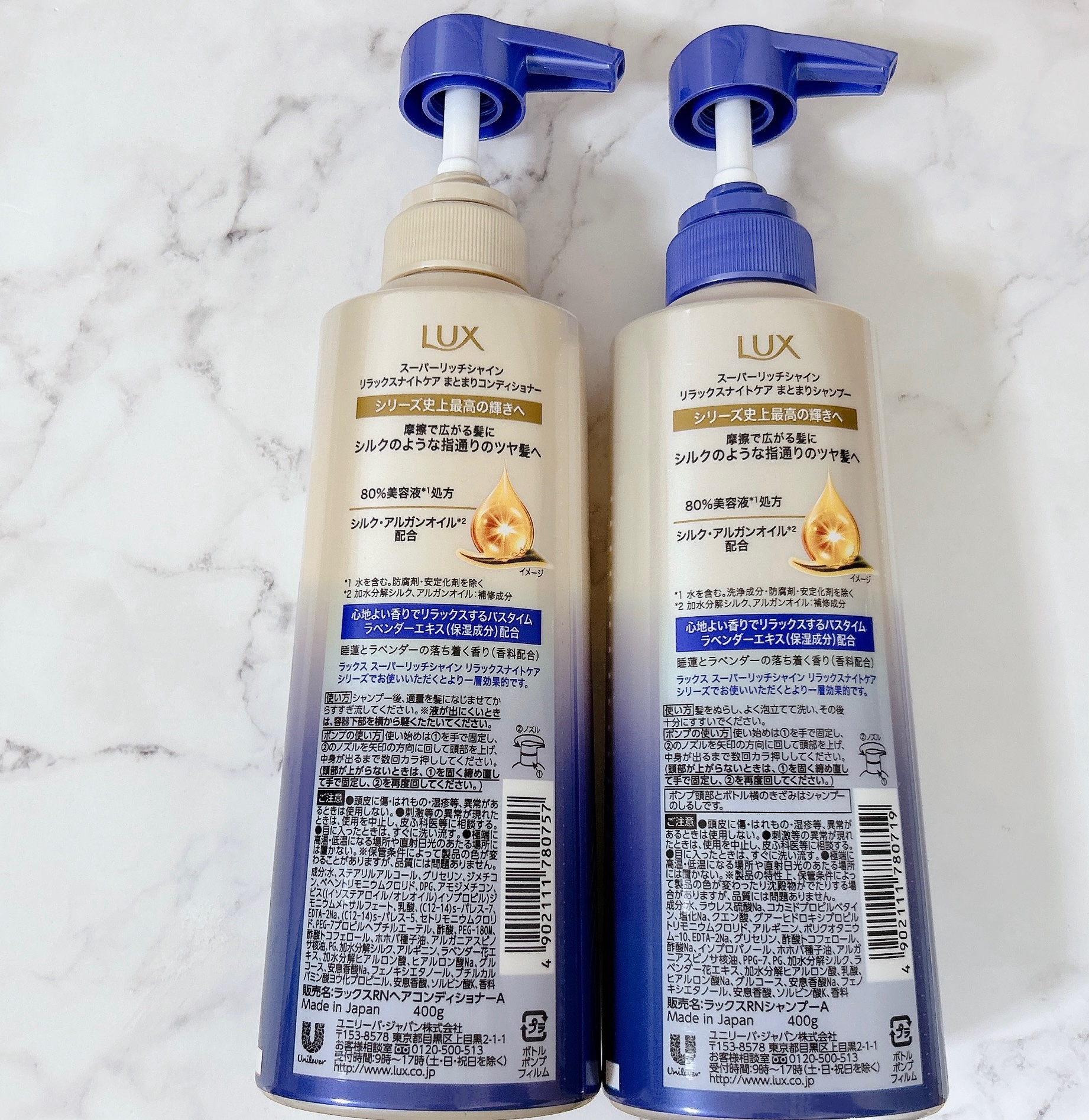 - <シャンプー(400g)> 水、ステアリルアルコール、グリセリン、ジメチコン、ベヘントリモニウムクロリド、DPG、アモジメチコン、ビス((イソステアロイル/オレオイル)イソプロピル)ジモニウムメトサルフェート、乳酸、(C12-14)s-パレス-7、EDTA-2Na、(C12-14)s-パレス-5、セトリモニウムクロリド、PEG-7プロピルヘプチルエーテル、酢酸、PEG-180M、酢酸トコフェロール、ホホバ種子油、アルガニアスピノサ核油、PG、加水分解シルク、アルギニン、ラベンダー花エキス、加水分解ヒアルロン酸、ヒアルロン酸Na、グルコース、安息香酸Na、フェノキシエタノール、ブチルカルバミン酸ヨウ化プロピニル、安息香酸、ソルビン酸K、香料 <コンディショナー(400g)> 水、ステアリルアルコール、グリセリン、ジメチコン、ベヘントリモニウムクロリド、DPG、アモジメチコン、ビス((イソステアロイル/オレオイル)イソプロピル)ジモニウムメトサルフェート、乳酸、(C12-14)s-パレス-7、EDTA-2Na、(C12-14)s-パレス-5、セトリモニウムクロリド、PEG-7プロピルヘプチルエーテル、酢酸、PEG-180M、酢酸トコフェロール、ホホバ種子油、アルガニアスピノサ核油、PG、加水分解シルク、アルギニン、ラベンダー花エキス、加水分解ヒアルロン酸、ヒアルロン酸Na、グルコース、安息香酸Na、フェノキシエタノール、ブチルカルバミン酸ヨウ化プロピニル、安息香酸、ソルビン酸K、香料