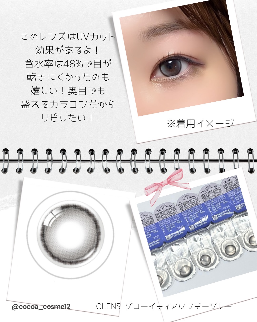 - 韓国カラコン業界の話題のブランド『OLENS(オーレンズ)』の日本正式承認商品シリーズ。世界中から注目を浴びるグループ「NewJeans (ニュージーンズ)」がイメージモデル。 OLENSの中でも圧倒的人気を誇る「グローイ」から、もっとうるみとぷるぷる感をプラスした「うるぷる×ツヤ盛れ!」な『グローイティア』が新シリーズとして登場。OLENSだから実現できる極微細着色との新感覚水光レンズです。 「Tear(涙)」から名を取ったように、まるで涙を浮かべたような、守ってあげたくなる目元を演出できます。 ■OLENS Glowy Tear (オーレンズグローイティア) ・枚数:1箱10枚入り ・カラー :全2色 ■使い方 コンタクトレンズは高度管理医療機器です。必ず眼科医の処方に従って購入してください。 ■使用上の留意事項 コンタクトレンズは高度管理医療機器です。眼科医の指導に従い装用期間を厳守し、正しくお使いください。眼の定期検査を必ず受けてください。添付文書を必ず読み、取扱方法、装用時間を守って正しくお使いください。少しでも異常を感じたら、直ちに眼科医の検査を受けてください。