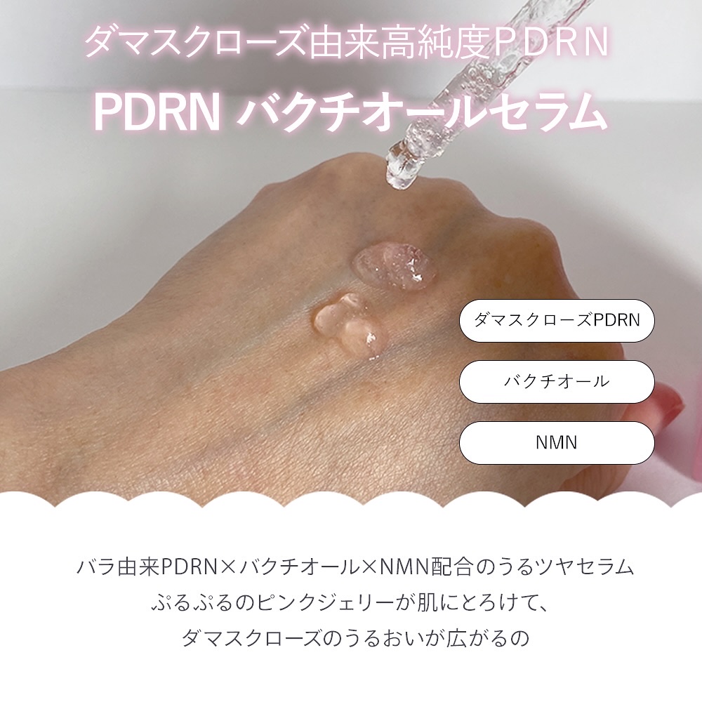 - ぷるんと弾けるピンクジェリーが、肌の角質層までうるおいを届け、ハリと輝きを保つ。 高品質「PDRN※1」×「バクチオール※2」で、ゆらぎにくい、弾むような肌へ。 1.うるおいを届け、弾むような肌に ダマスクローズ由来のPDRN※1 は、肌に寄り添う発想から生まれたもの。肌をいきいきとした印象へと導きながら、肌本来のハリ・弾力を引き出し、なめらかでキメの整った肌へ。 2.未来の自分のために、エイジングケア※5の第一歩として 植物由来のバクチオール※2 とNMN※6 が、肌本来のバリア機能を高めながら、ハリのある肌へと導きます。敏感な肌にもやさしい、穏やかなエイジングケア※5 が可能です。 3.植物由来成分で、優しくケア 肌に負担をかけにくい、こだわりの植物由来成分を配合。「皮膚低刺激テスト※7」をクリアしているため、敏感肌の方でも安心して日常のケアに取り入れることができます。 4.まるでジェリーな新感覚テクスチャー ぷるんとしたみずみずしいテクスチャーにより、べたつかず肌の角質層まで浸透※8。機能性だけでなく使い心地にも優れた、新感覚美容液となっています。 ※1) DNA-Na(整肌成分) ※2) 整肌成分 ※5) エイジングケアとは年齢に応じたお手入れのこと ※6) ニコチンアミドモノヌクレオチド(整肌成分) 2025年5月9日(金)よりQoo10にて先行発売