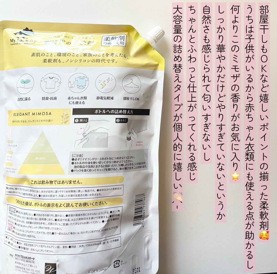 マイランドリー大容量ミモザの香り🌸香りについてミモザの自然な香りがとても上品で、人工的すぎない優しい仕上がり。部屋干し中もほんのり香って気持ちいい!🌿使用感ノンシリコンなのにふんわり仕上がって、洗い上がりの質感に満足。静電気も気にならなくなり...