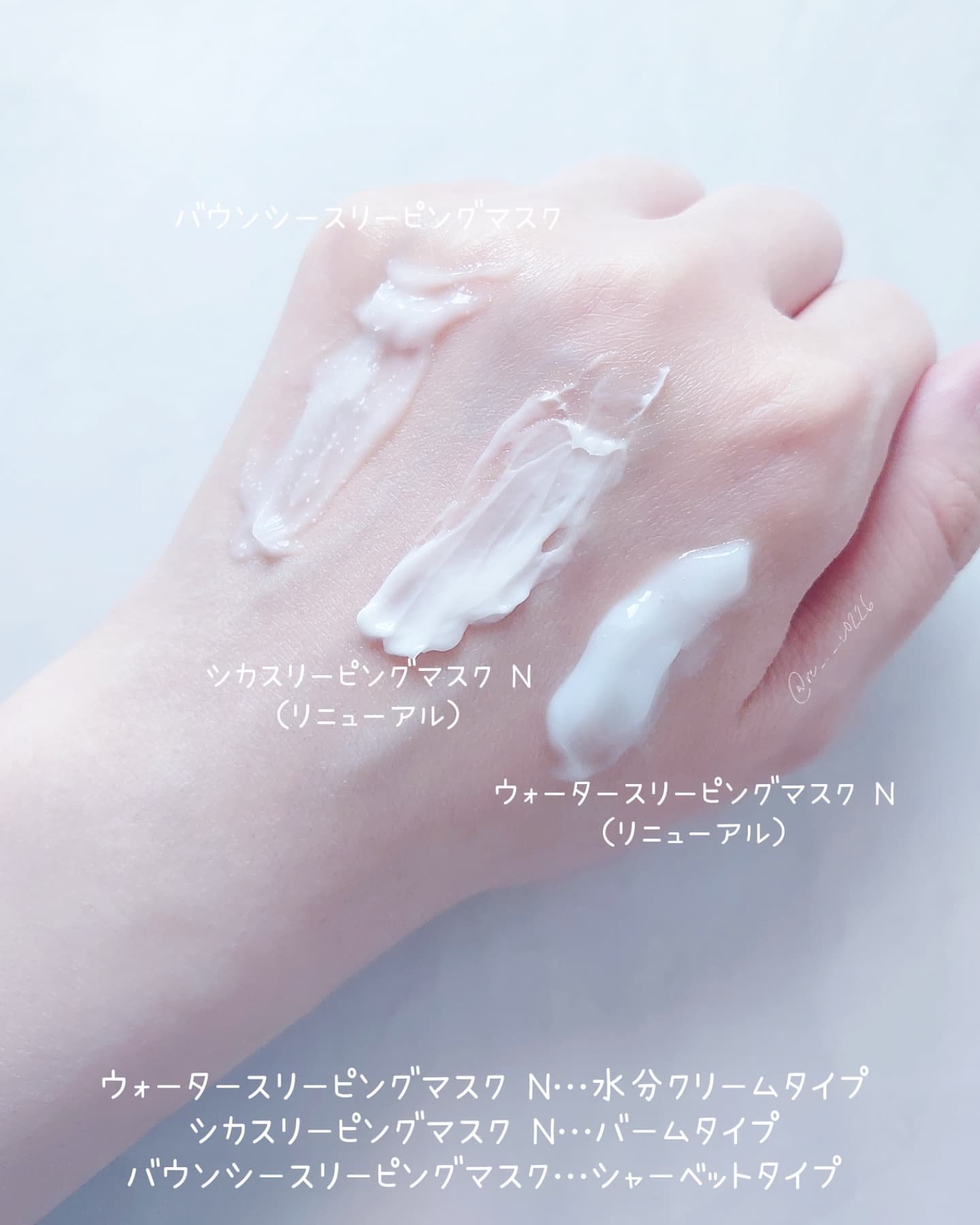 LANEIGEのスリーピングマスク3種のテクスチャー比較紹介💗今回ウォーターとシカがリニューアルしました👏ウォーターのリニューアル前のは持ってたから比べてみたけど匂い以外の違いはわからなかった🥹(私の修行が足りない為)個人的にお気に入りはバウ...