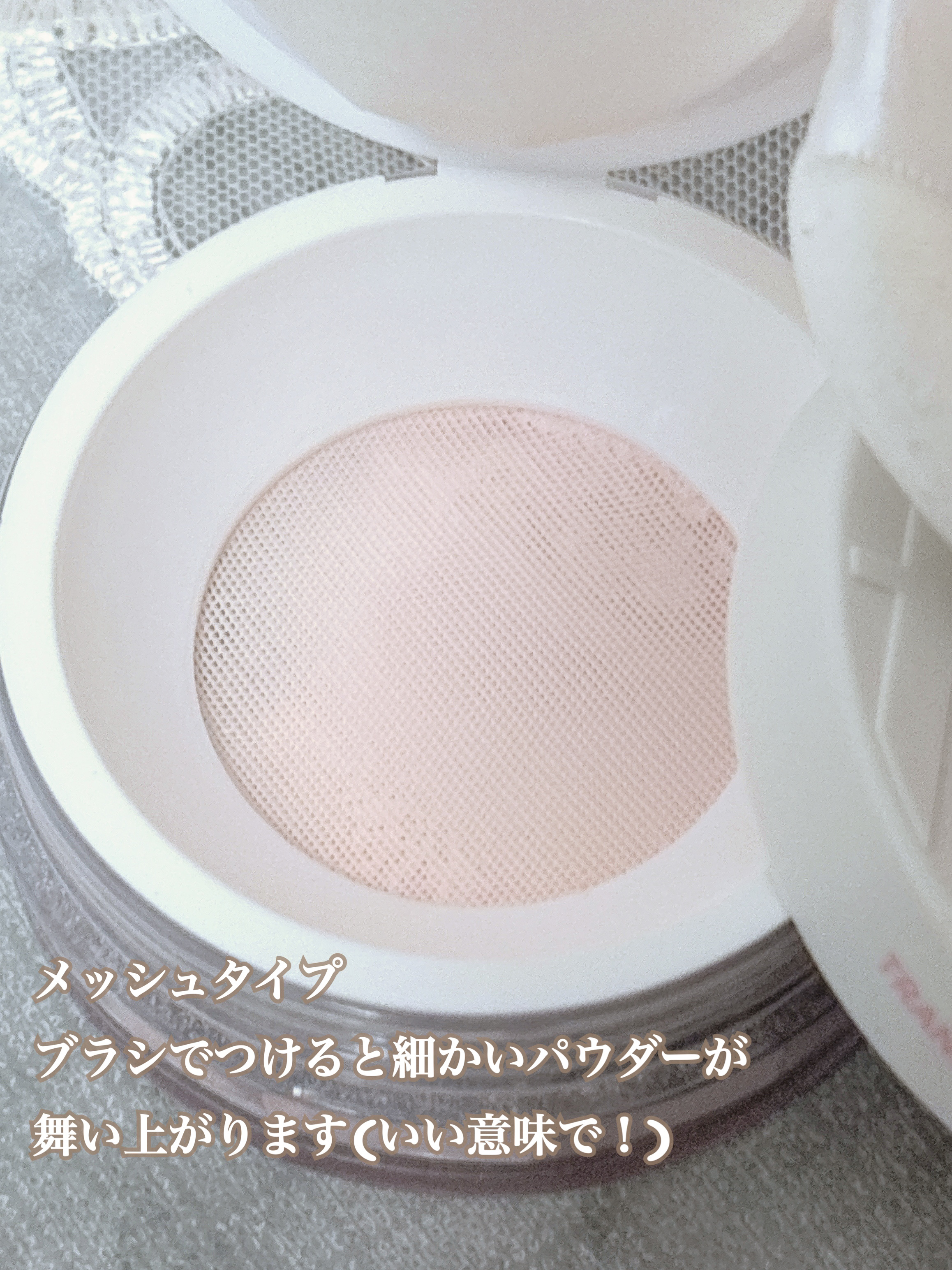 こちらのパウダーはその願いをしっかり叶えてくれるサラサラ系パウダーでした! 粉が細かくふわっふわで、厚ぼったくならずにマット肌へ仕上がってくれる! ブラシで磨くようにササササッとはらうと、余分な粉を落とす&ちょうどよく密着してくれて、セミマットっぽい仕上がりにしてくれます!!! 粉が出てくるところがメッシュになっているところもポイント高いです。パフやブラシにしっかりと粉を含ませられるので、私はメッシュ派!
