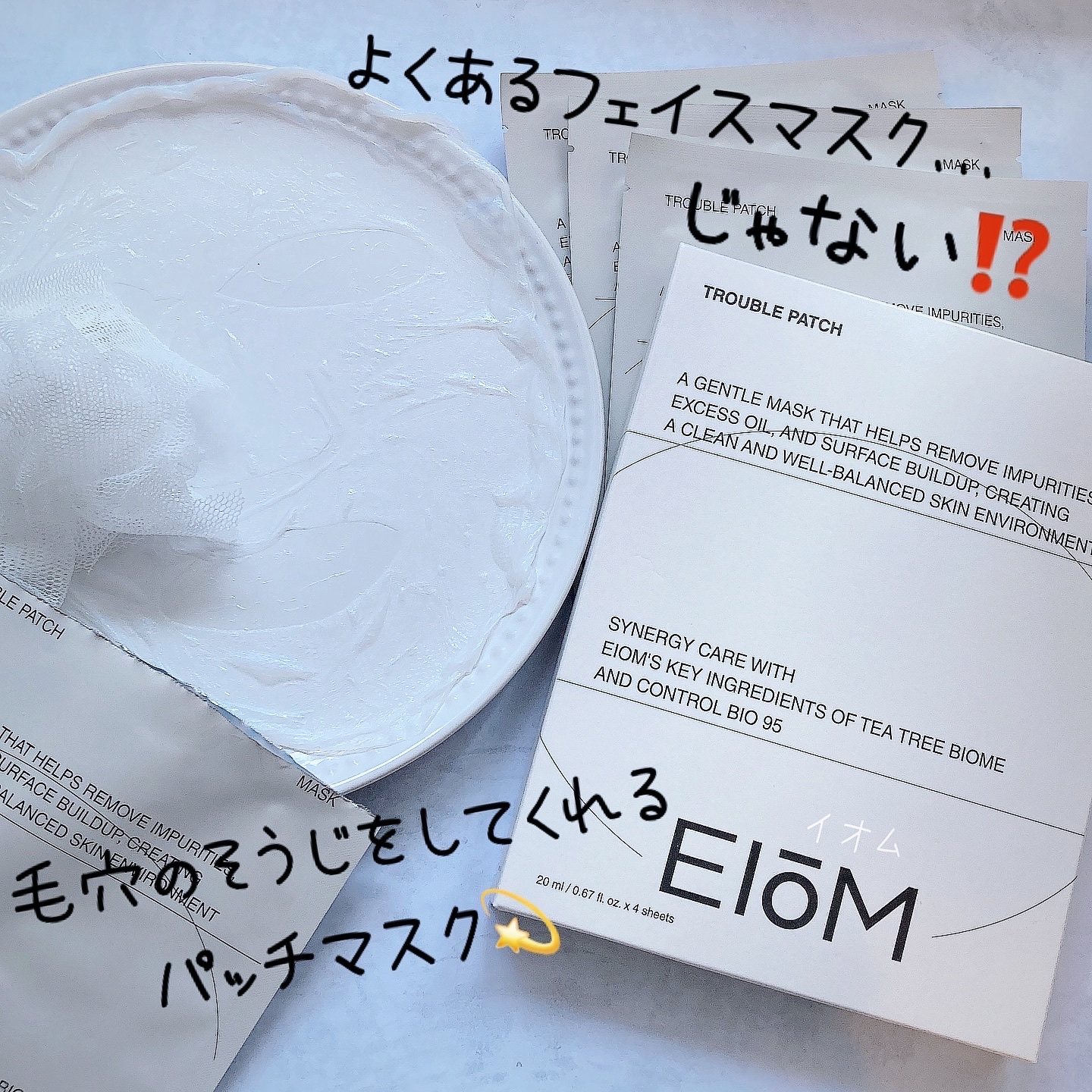 EIOMトラブルケアパッチマスク汗や角質により詰まった毛穴汚れをケア95億個もの乳酸菌由来成分*肌を整え、健やかな肌へティーツリーバイオームなど配合*生菌ではなく、乳酸菌由来の死体です。シートがピタッとしていて若干匂いがするかな?くらい50〜...