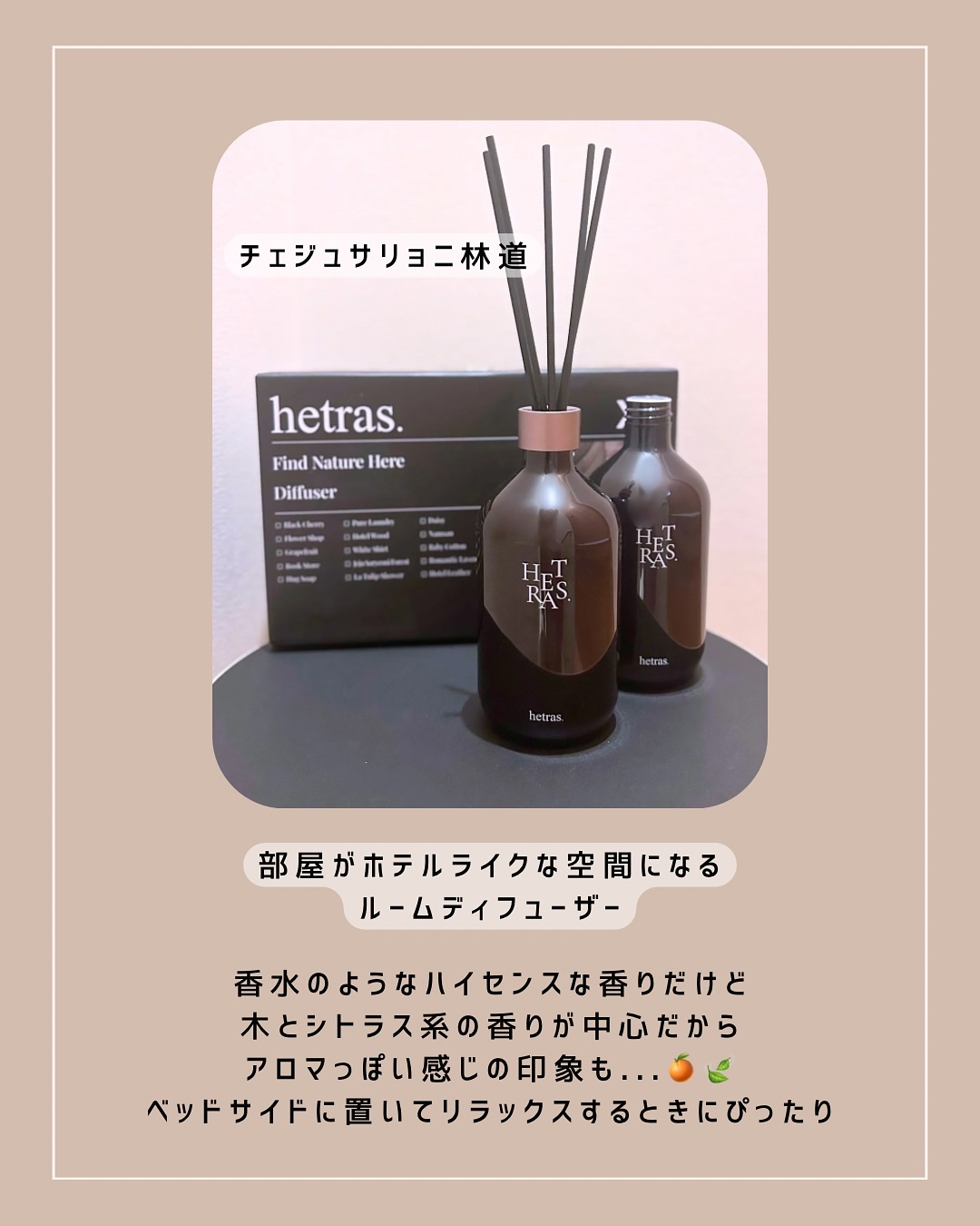 高級ホテルやサロンのような上品で特別な香りを、スタイリッシュなパケとリーズナブルな価格でお届けしている韓国のフレグランスブランドです。 高級ホテルロビーの落ち着いた雰囲気に加え、心地よいソファーに座りまったりと癒しの時間を過ごしてるような香り 自然に優しい植物性エタノールを使用していて、ボトルは押すとペコペコってなるタイプだから捨てやすいのも有難い…