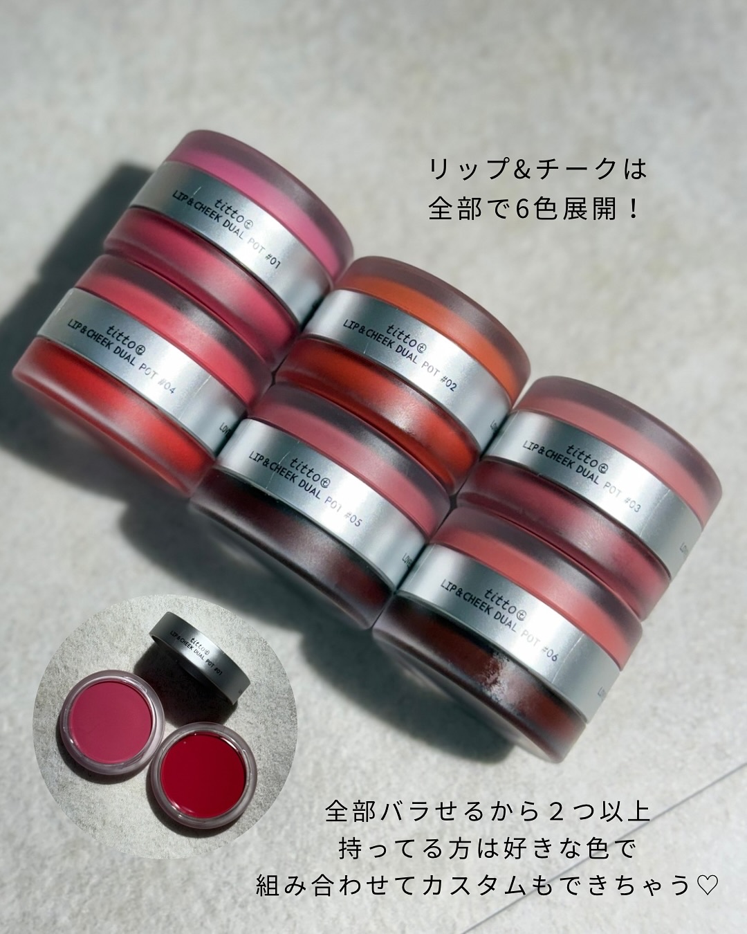 自分だけのカラーTITTOリップ&チーク𝐩𝐨𝐢𝐧𝐭①リップ&チークになってて1つで2役!②体温でとろけるようなメルティテクスチャー③キーリング付きでカバンに付けて持ち歩ける④じんわりなじむ発色で色んな肌トーンにも相性抜群⑤韓国ヴィーガン認証取...