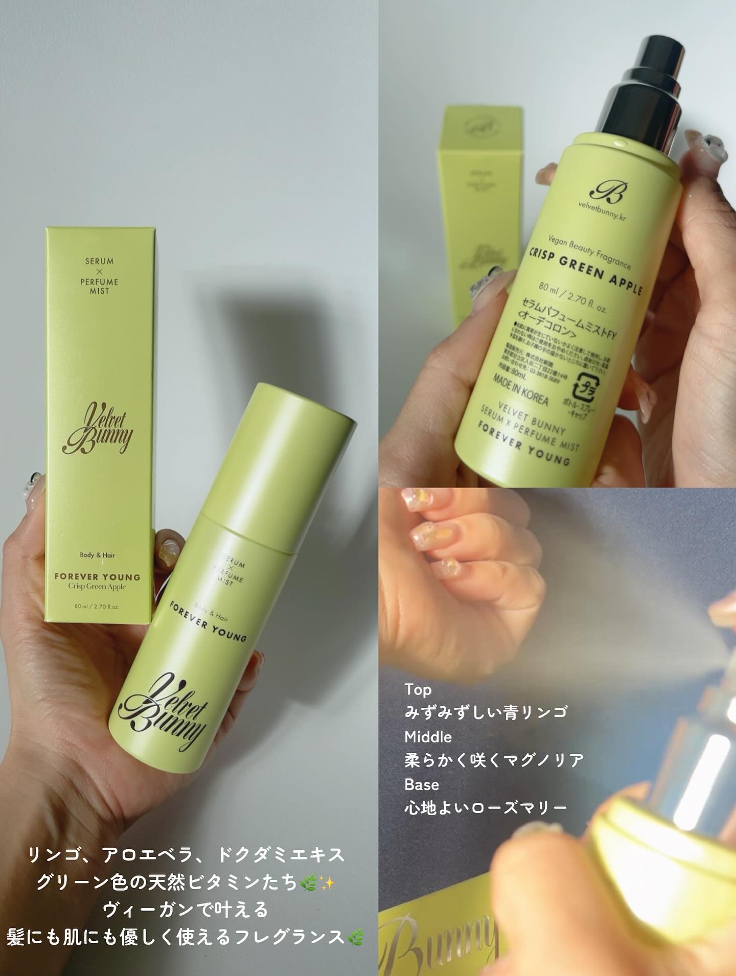 - 100%プレミアムウィーガンフレグランス 天然香料のオードトワレパフュームと整肌セラムをミストに込めて── FOREVER YOUNG - 5am, Gentle Sunrise 爽やかな朝、胸がときめく1日の始まり ◆NOTE : 爽やかな青りんごの香り ◆青りんご・マグノリア・ローズマリー 収穫したばかりのみずみずしい青りんごをかじったような爽やかでフルーティーな香り!ほのかに滲み出る甘美なハーブの残り香が清涼感のある6月の日差しを思い出させます。 ◆NUTRITION:自然由来のレシピ、グリーンフォーミュラ ◆植物由来の天然セラムですっきり整肌ケア ・肌の潤いを守るセラミド ・潤いたっぷりのりんごエキス ・肌の整肌を助けるアロエベラ葉(全て保湿成分) ◆PERFORMANCE:ほんのりと長続きするオードトワレ 濃度5%+ 最大5時間持続:こだわりの心地よいバランスでほんのりと漂う残り香! 爽やかな青りんごの残り香が髪の毛と肌を柔らかく包み込み長時間ほんのりと漂います。 ◆BRAND NEW FRAGRANCE:肌に優しく染み込むような健康的な香り ◆イギリスのCPLAromaと共同で厳選したヘルシーな香り、 プレミアムヴィーガンアロマを開発しました