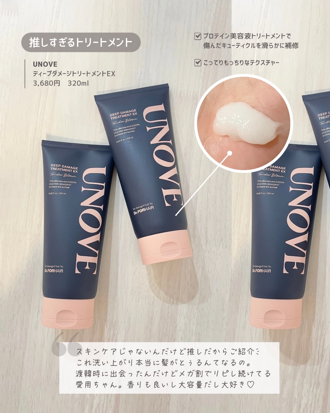 人気のヘアケアブランドUNOVE(アノブ)こちらは、ハイダメージヘアもたっぷりの*¹タンパク質*²で集中補修してくれるというヘアトリートメント。アノブディープダメージトリートメントEX150ml私もヘアオイルの方はQoo10で購入して...