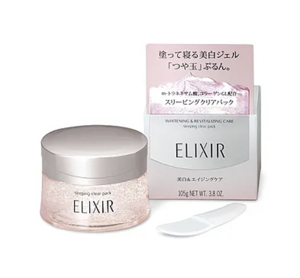 - 【医薬部外品】 「つや玉」ぷるん 塗って寝る美白ジェル 夜のお手入れの最後に塗って寝るだけの美白ジェル。 眠っている間も、たっぷりのうるおいと美容成分に一晩中肌をひたすような高弾力ジェルでうるおいに満ちたハリと透明感、そして「つや玉」がぷるんと輝く肌へ。 忙しい方にも、手軽に続けていただけるスペシャルケアアイテムです。 中味を取り出しやすいスパチュラ付き。 メラニンの生成を抑え、シミ・そばかすを防ぎます。 (エリクシール ブライトニング ジェル) 使用方法 ●週2~3回を目安に、夜のお手入れの最後にお使いください。毎晩でもお使いいただけます。 ●スパチュラでさくらんぼ1コ分を目安にとり、顔の5カ所(両ほお・額・鼻・あご)におき、顔全体にむらなくのばします。 ●パックのように肌を覆ったまま、触れずにしばらく待つと、ジェルが肌になじんでいきます。そのまま布団に入っておやすみいただけます。 ※なじむ時間には個人差があります。 使用上注意 食べ物ではありません。ご家族の方が誤食されないようご注意ください。 ◇やわらかいジェルのため、キャップの開閉時や使用中に、ジェルがこぼれないようご注意ください。 ◇使用後は容器の口もととスパチュラをきれいにふきキャップをきちんと閉めて保管してください。 ◇ジェルが寝具などについた場合は洗濯してください。長期間放置すると、シミになることがあります。 ◇配合されている粒の大きさにばらつきがある場合がありますが、品質に問題ありません。 ◇直射日光にあたってお肌に異常があらわれたときには、ご使用をおやめください。 ◇日のあたるところや高温のところに置かないでください。 ◇冷蔵庫で冷やしてお使いいただくこともできますが、その場合は、必ず使用後すぐに冷蔵庫に戻し、使い切るまで冷蔵庫で保管してください。 ◇絶対に冷凍庫には入れないでください。凍ってしまうと品質が劣化する恐れがあります。 ※2025年6月「エリクシール ホワイト スリーピングクリアパック C」は「エリクシール ホワイト ブライトニング スリーピングジェルパック」に商品名が変更になりました。