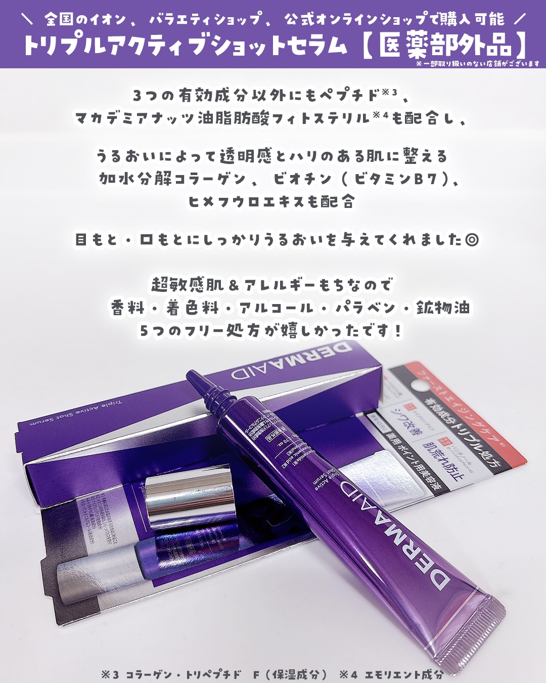 \日本初*!ダーマエイドの新提案/💜トリプルアクティブショットセラム【医薬部外品】 販売価格:税込2,310円✳︎配合成分 美白*¹とシワ改善の「ナイアシンアミド」 美白*¹の「トラネキサム酸」 肌荒れ防止の「D-パントテニルアルコール」無...