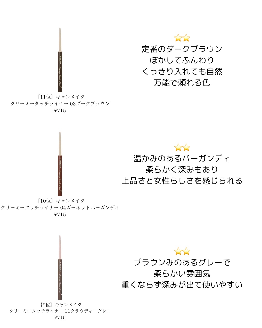 | ジェルアイライナーランキング第6位 | とろけて固まる描き心地が描きやすい👌カラーによってメイクの印象が変わってメイクを楽しむことができるアイテムだと思う! | 詳細を見る | |